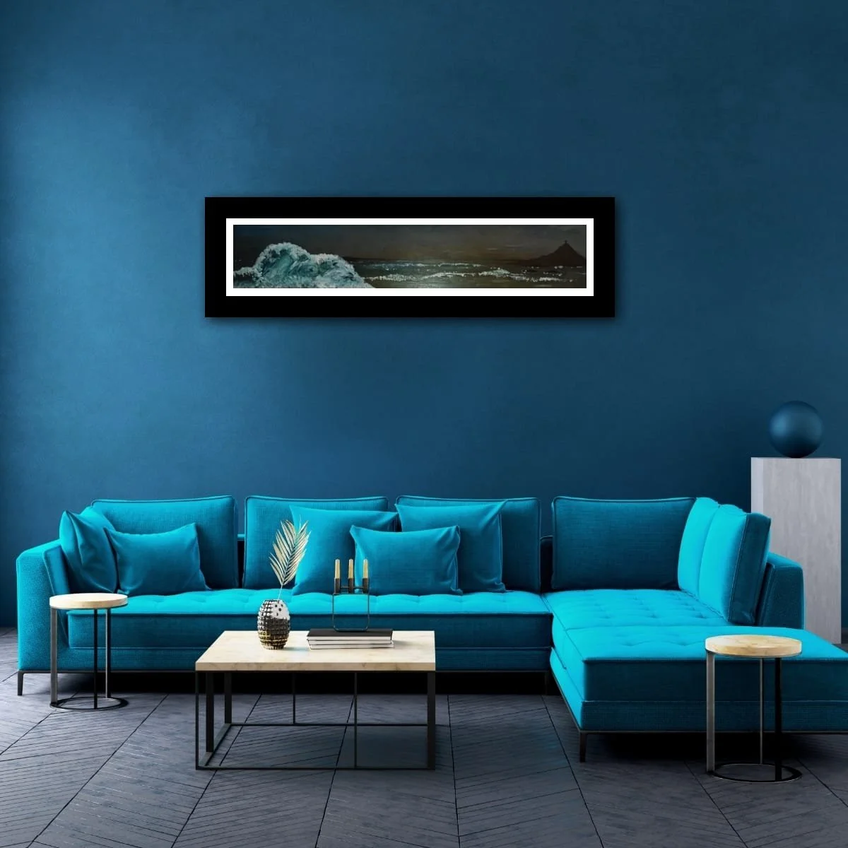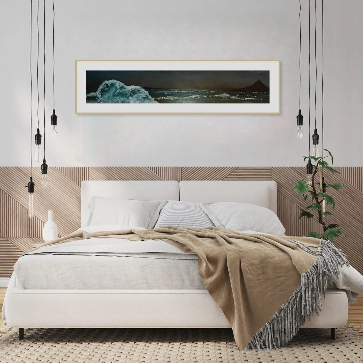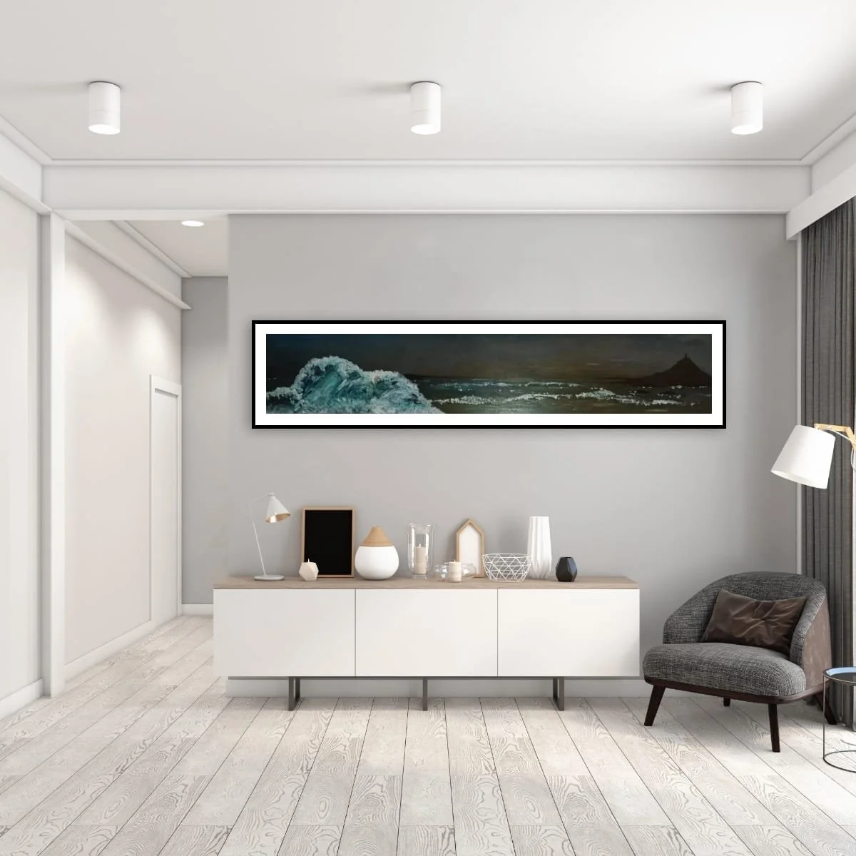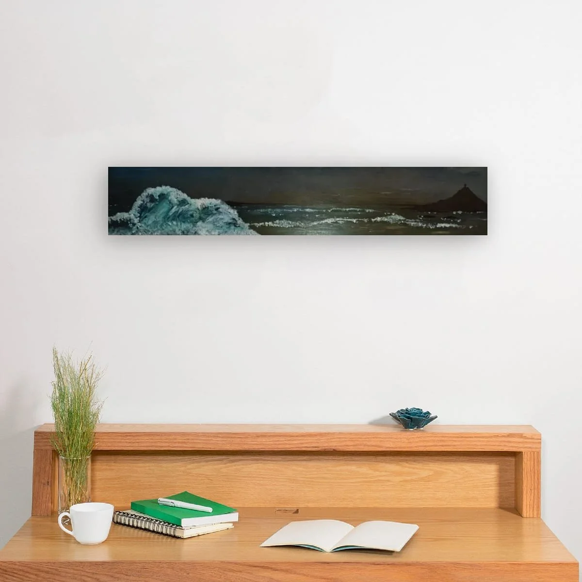 ‘Night Sky’ is a captivating seascape that masterfully captures the quiet drama of the ocean under the cover of darkness. Rendered in a panoramic format, this work draws the viewer into a world where moonlight and shadow dance across restless waves. The composition is anchored by a powerful, cresting wave in the foreground—its translucent blues and frothy whites rendered with expressive, textured brushwork—while the distant silhouette of a headland, crowned by a solitary structure, adds a sense of mystery and narrative intrigue.