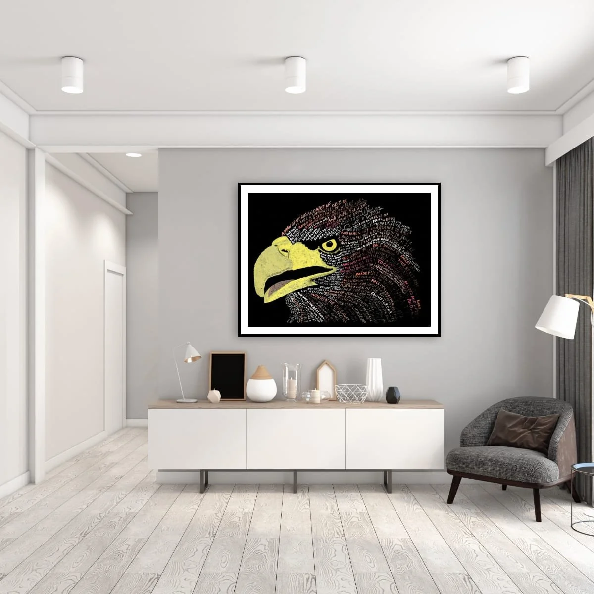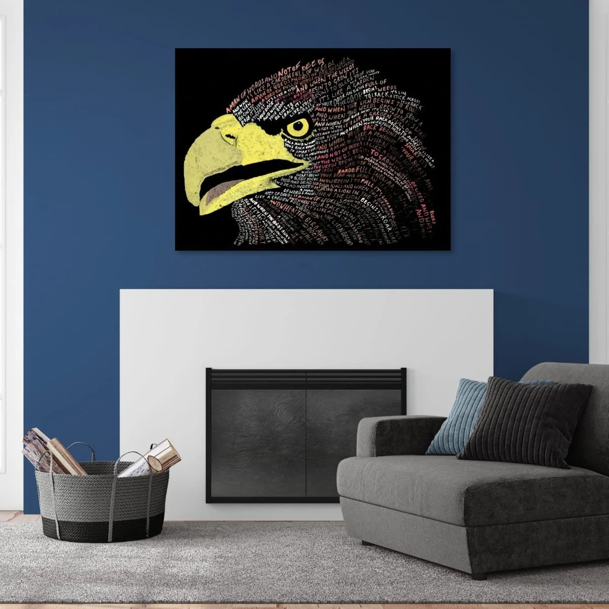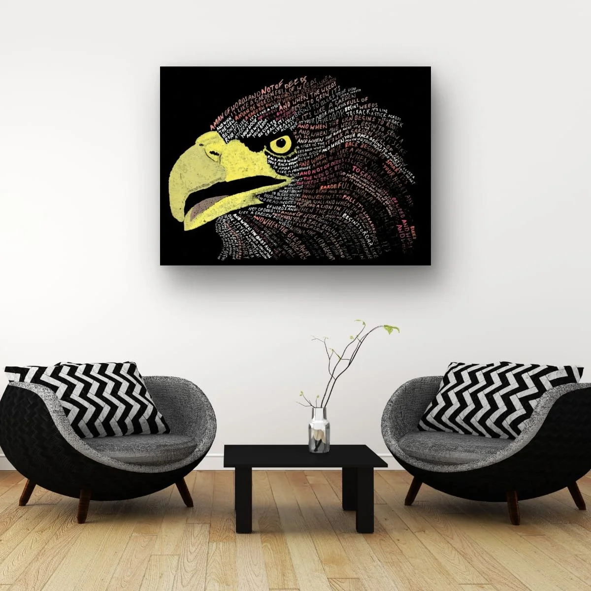 A visually arresting work that fuses the power of visual art with the resonance of the written word. This piece is meticulously crafted using hand-lettered text to form the striking profile of an eagle’s head, each contour and feather articulated through carefully chosen phrases. The result is a dynamic interplay between image and language, where the viewer is invited to both see and read, contemplating the symbolism of the eagle while absorbing the layered meanings within the text.