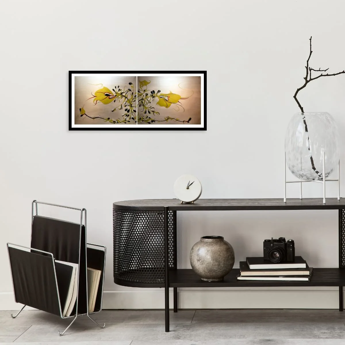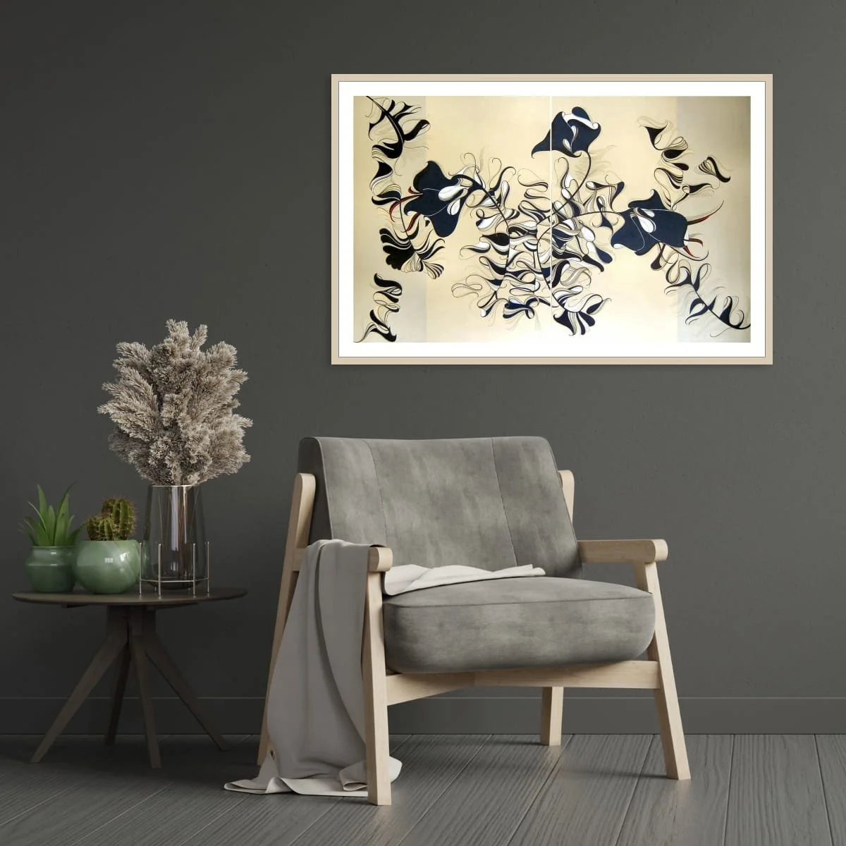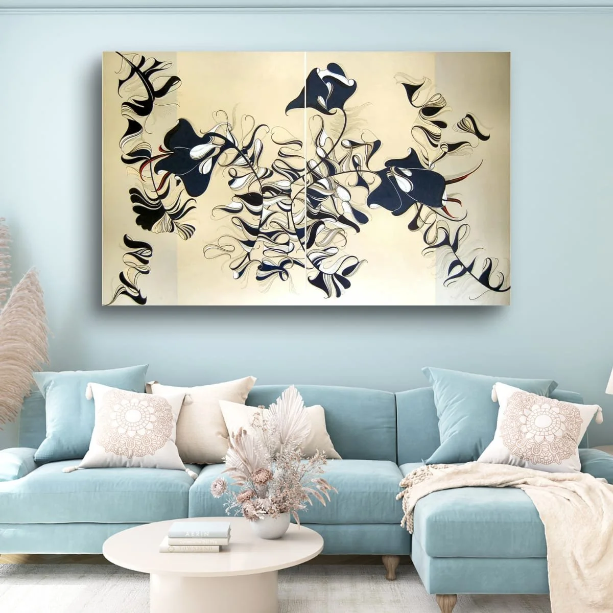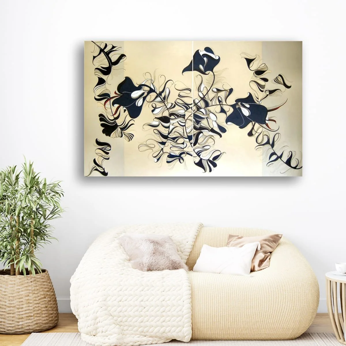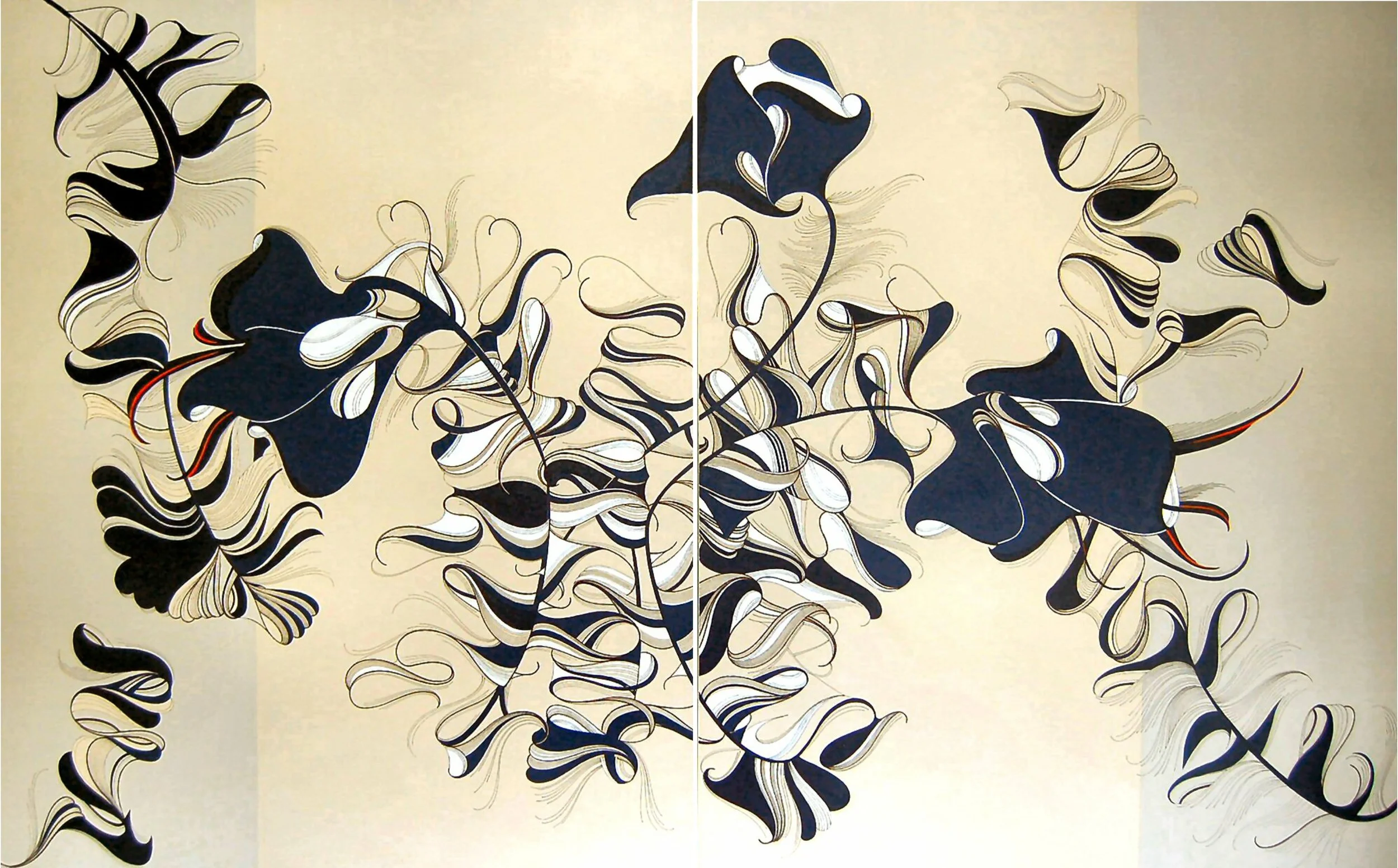 ‘Lilies’ is a sophisticated, large-scale diptych that reimagines botanical forms through a lens of abstraction and elegance. Flowing, ribbon-like shapes unfurl across a serene, neutral background, evoking the organic grace of lilies while transcending literal representation. The composition is a masterclass in line and movement: each petal and stem is rendered with exquisite precision, creating a sense of rhythmic harmony and gentle dynamism.