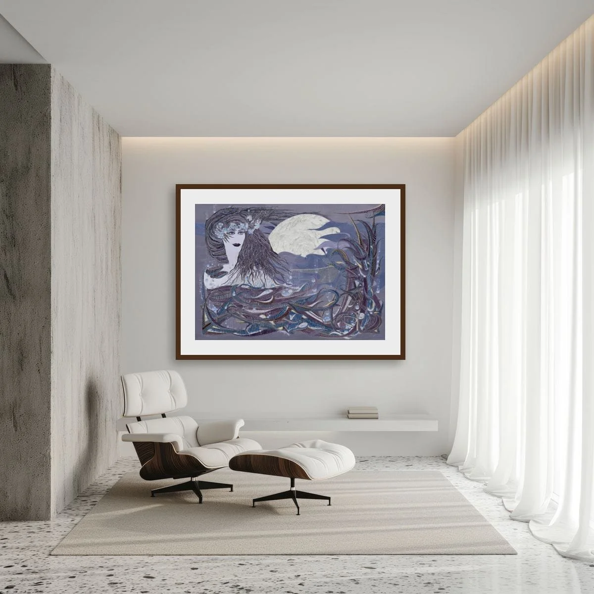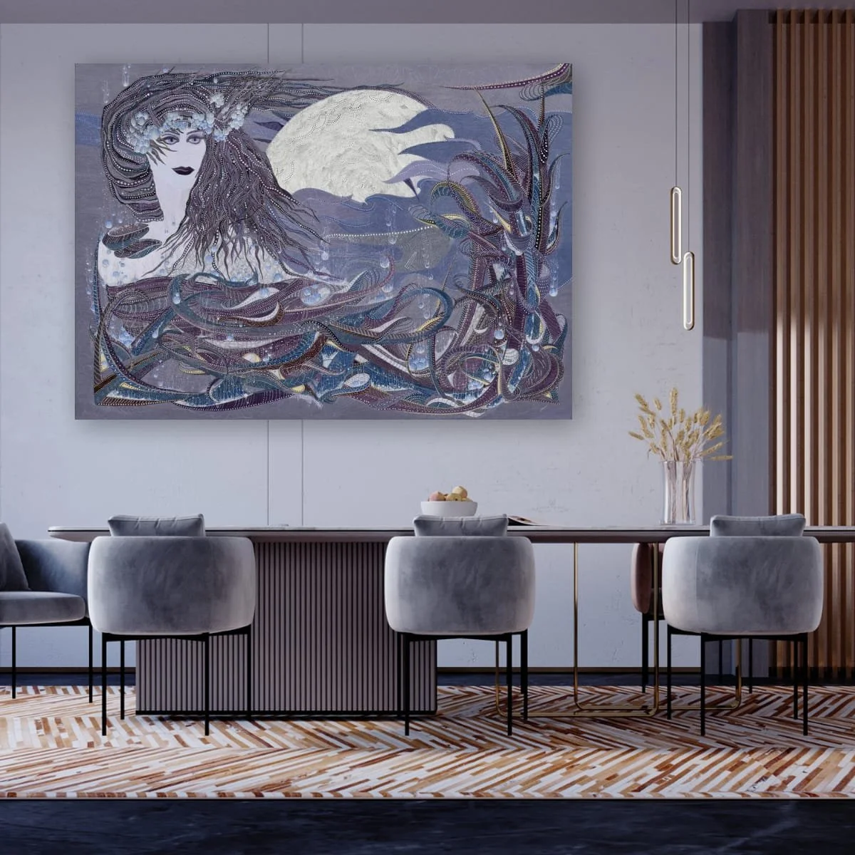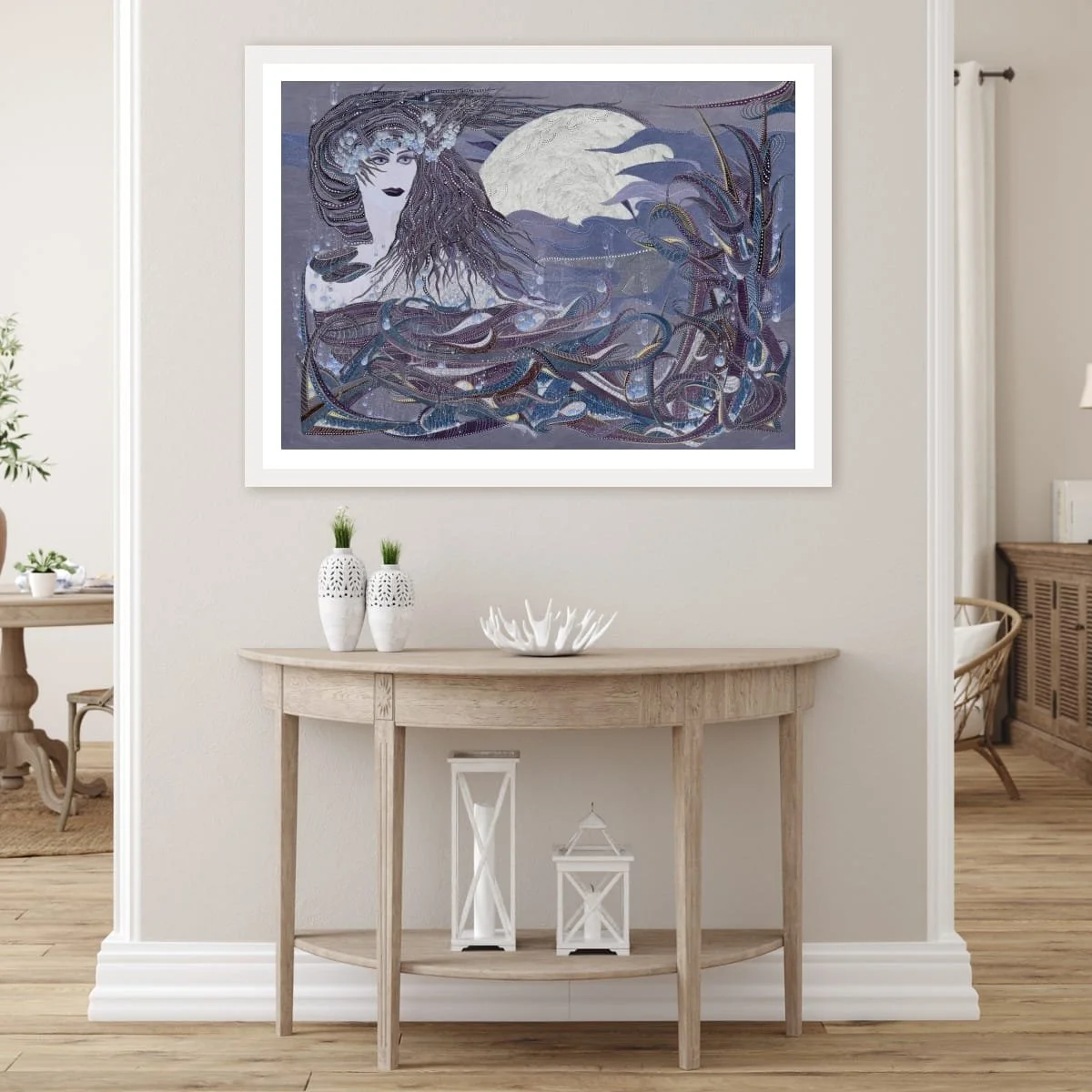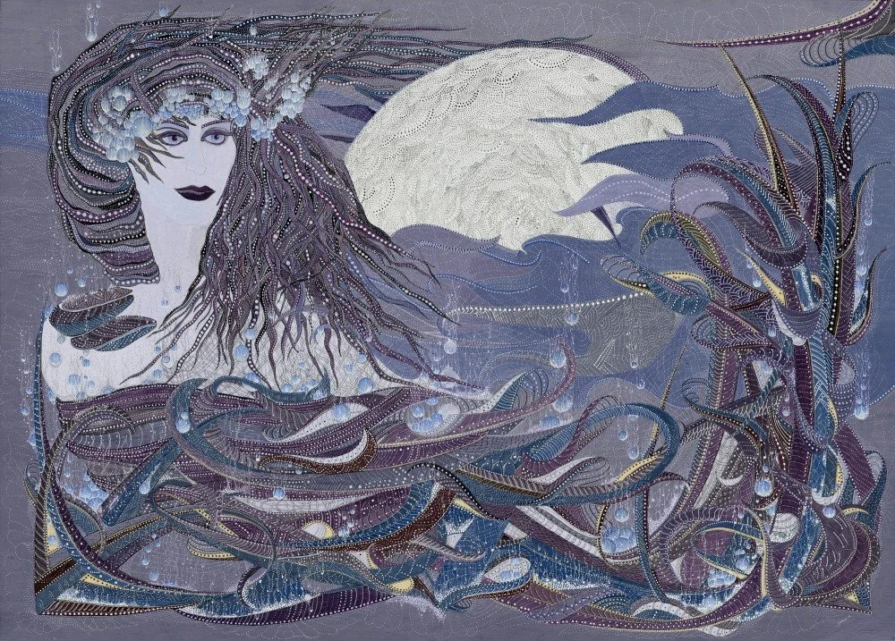 This piece draws viewers into a dreamlike tableau where the legendary figure emerges from swirling, stylised waters beneath a luminous, full moon. The composition is a symphony of flowing lines, delicate pointillism, and layered textures—each element meticulously rendered to evoke both movement and stillness.