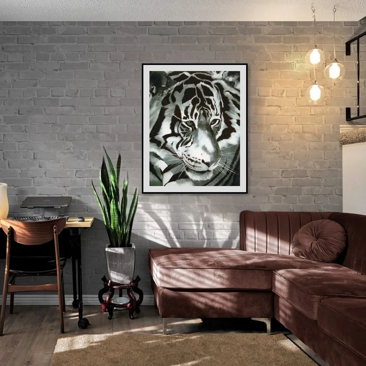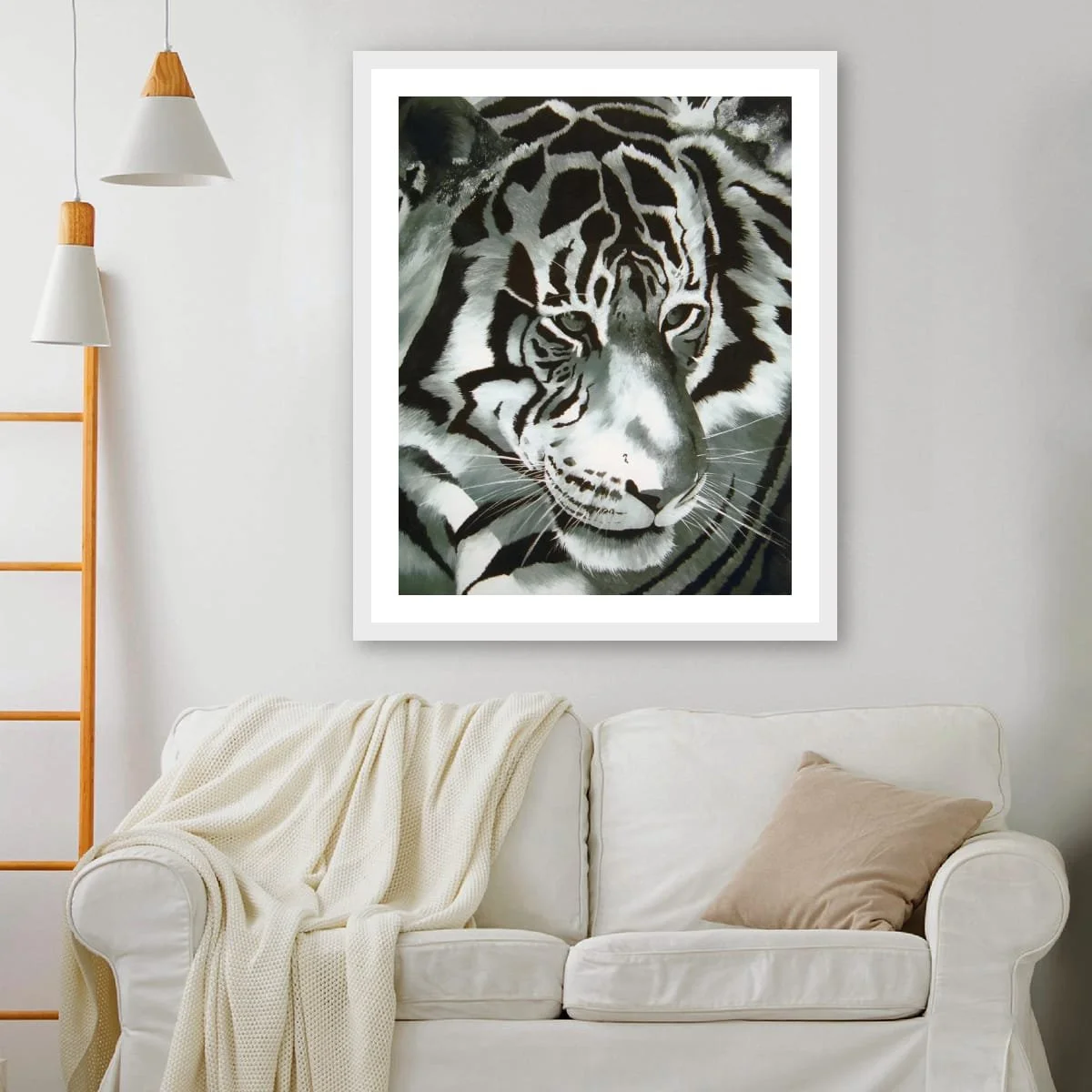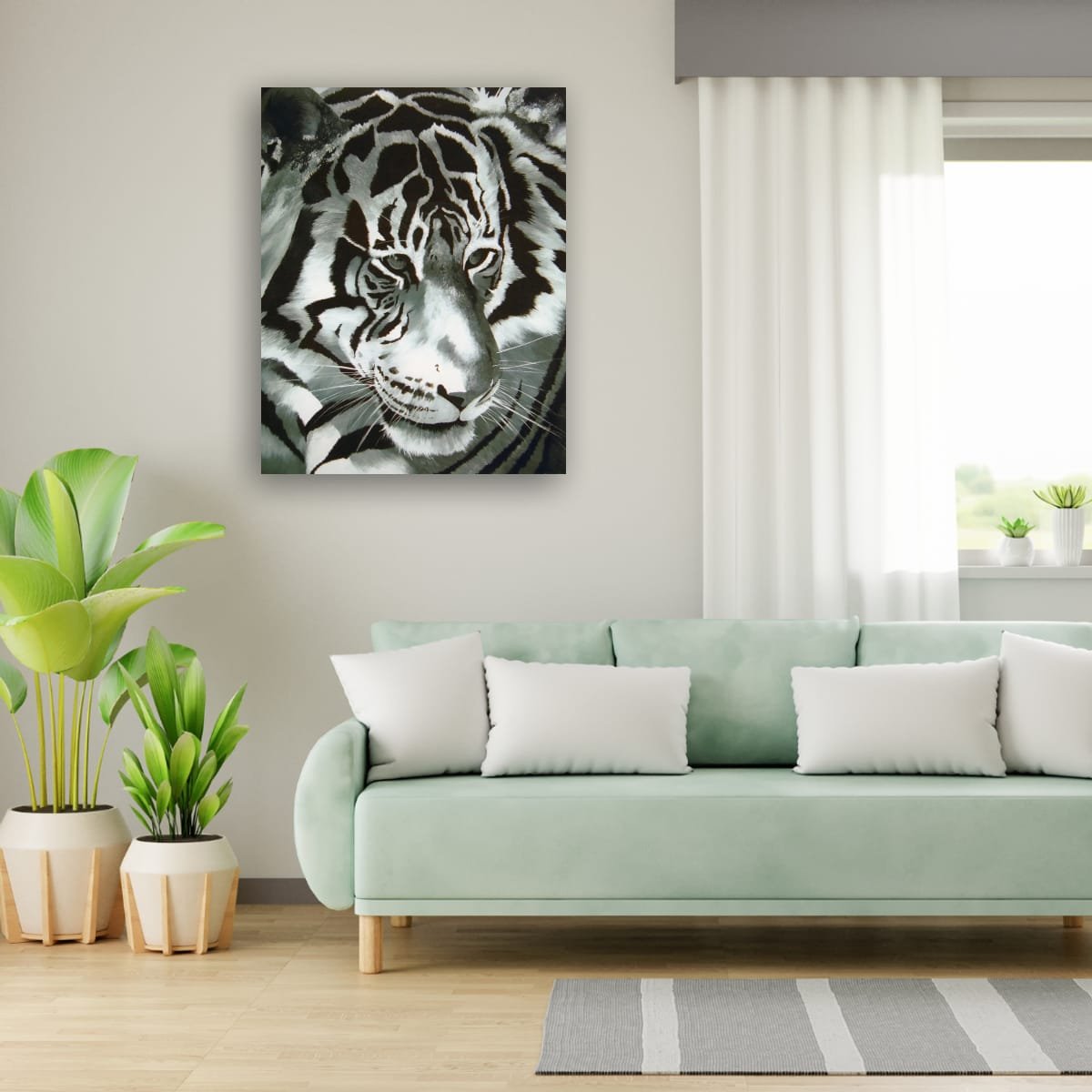The close-up composition emphasises the tiger’s piercing eyes and powerful features, inviting a moment of connection and contemplation. The interplay of light and shadow across the animal’s face highlights both its strength and vulnerability, making this work a true statement piece.