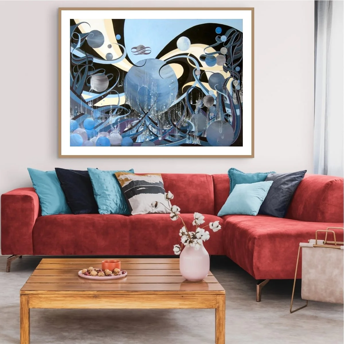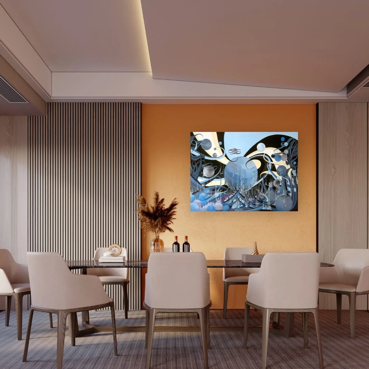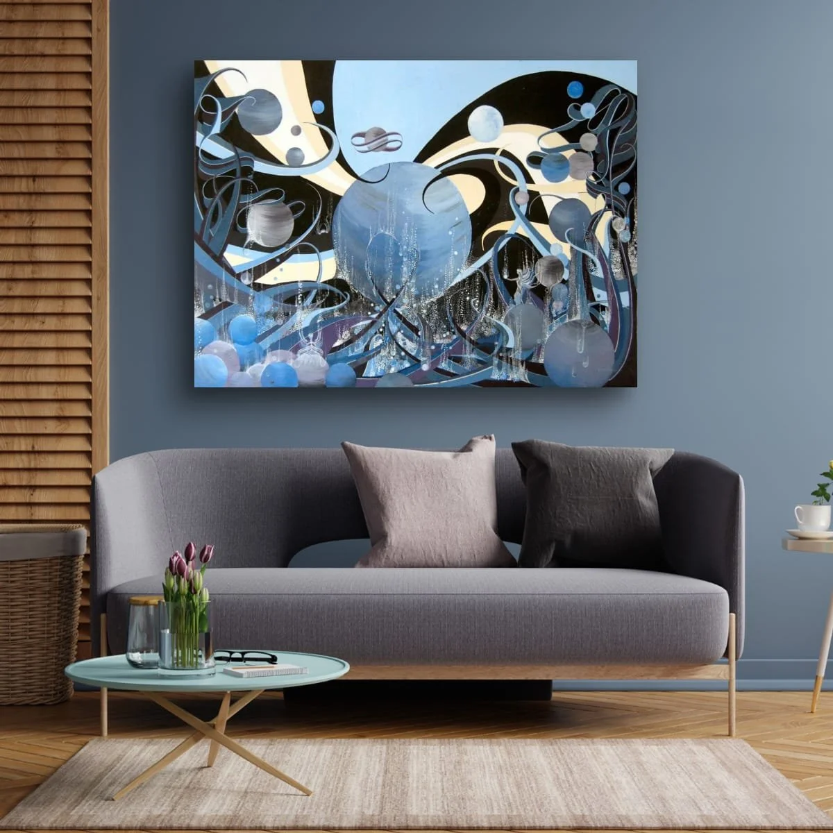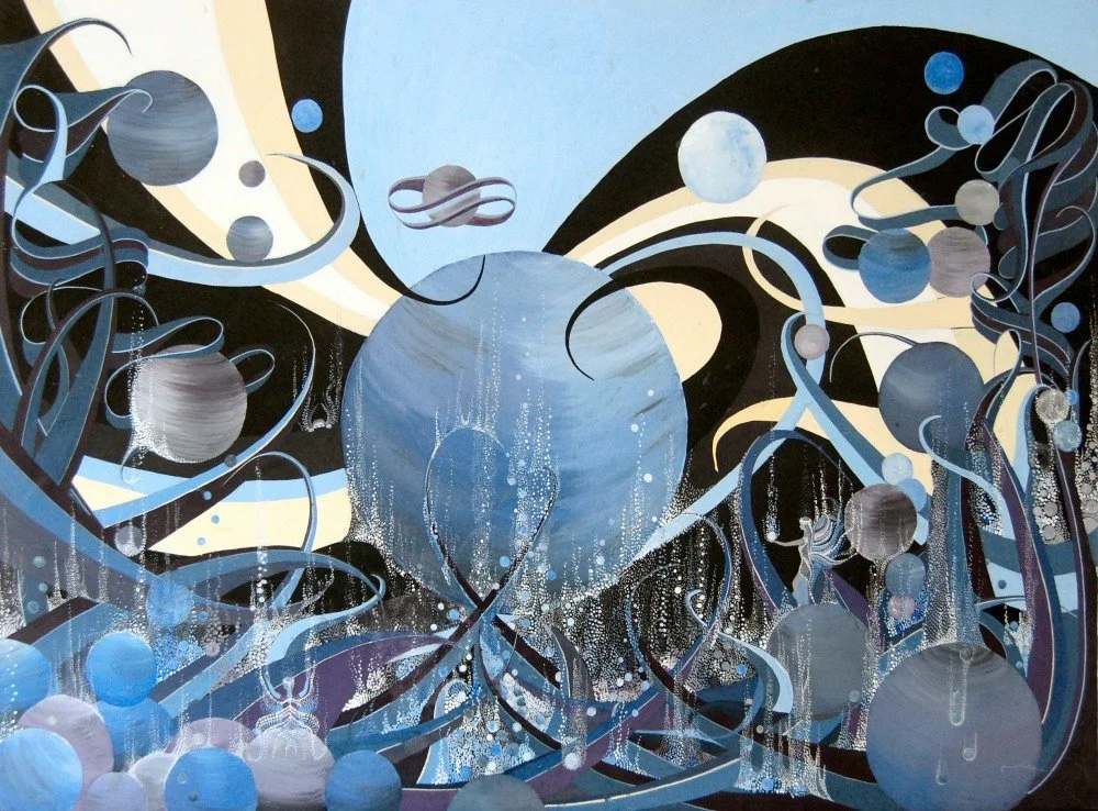 A captivating exploration of abstraction and cosmic imagination, inviting viewers into a universe where aquatic forms and celestial bodies intertwine. This large-scale work is a visual symphony of swirling lines, orbs, and cascading droplets, rendered in a sophisticated palette of blues, silvers, and soft creams. The composition evokes both the mysterious depths of the ocean and the infinite expanse of space, blurring the boundaries between the microcosm and the macrocosm.