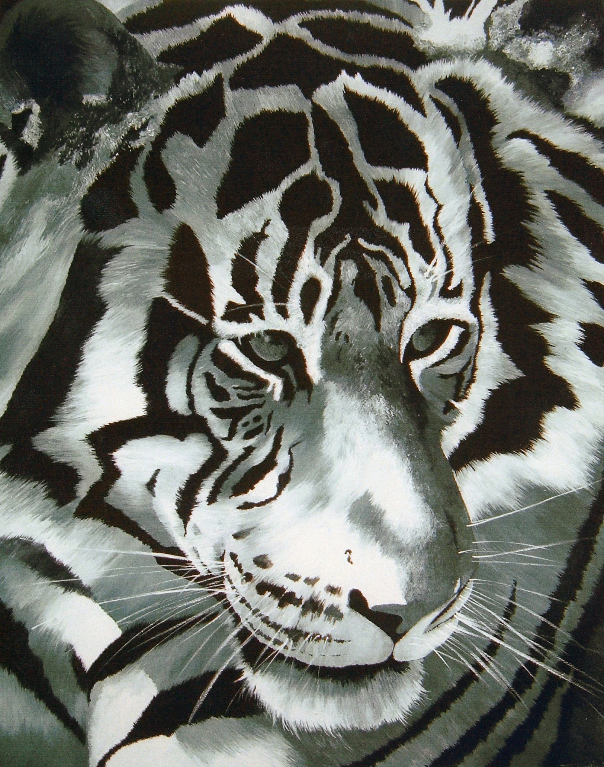 "BLUE" is a striking portrait that captures the raw majesty and quiet intensity of the tiger. Rendered in a sophisticated monochrome palette with subtle blue undertones, this piece draws the viewer in with its hypnotic gaze and intricate fur patterns. Every brushstroke is meticulously placed, creating a sense of depth and movement that brings the subject to life.