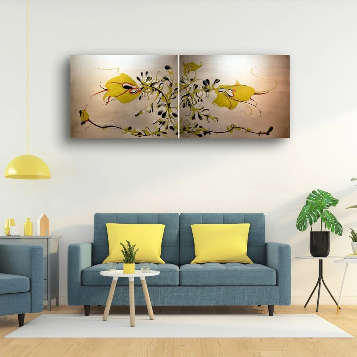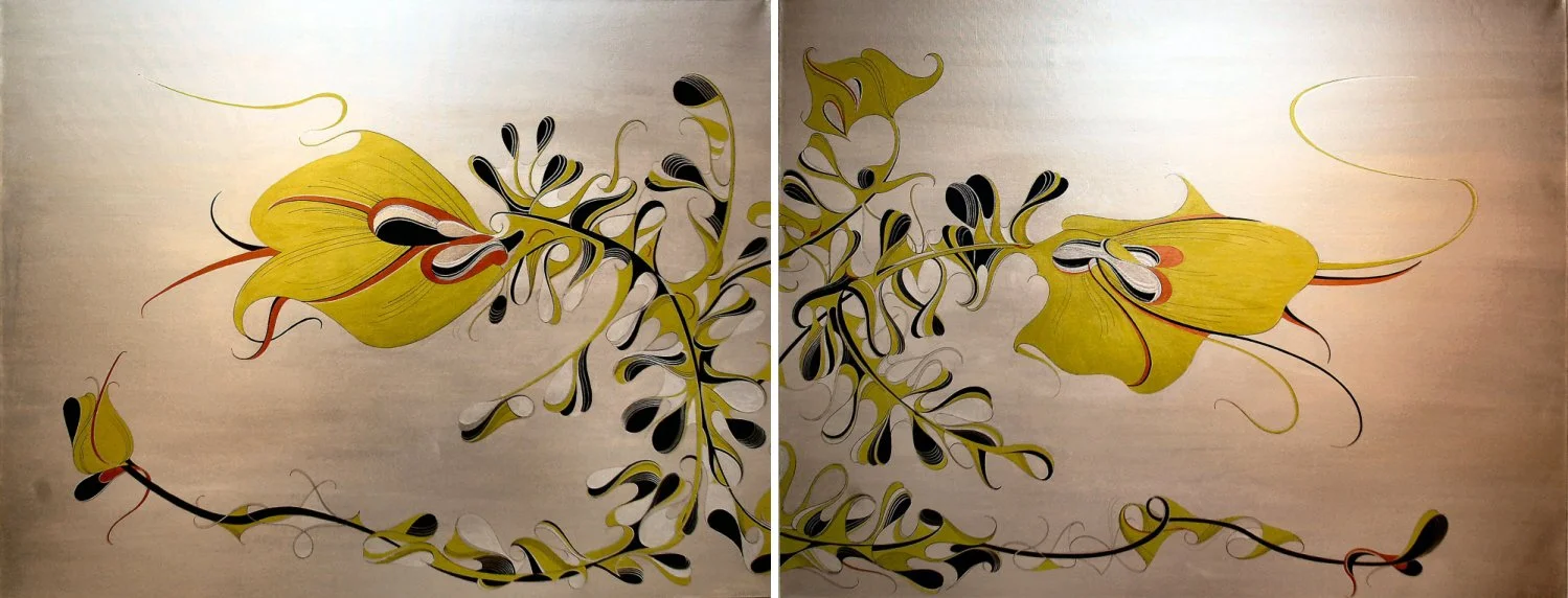 ‘Lilyesque’ is a commanding diptych that transforms the essence of botanical forms into a contemporary visual symphony. This large-scale work features sweeping, stylised lilies rendered in luminous metallic yellow, black, and red, set against a subtly radiant, neutral ground. The composition is alive with movement: elegant, ribbon-like tendrils and petals unfurl and intertwine, creating a sense of organic rhythm and dynamic flow.
