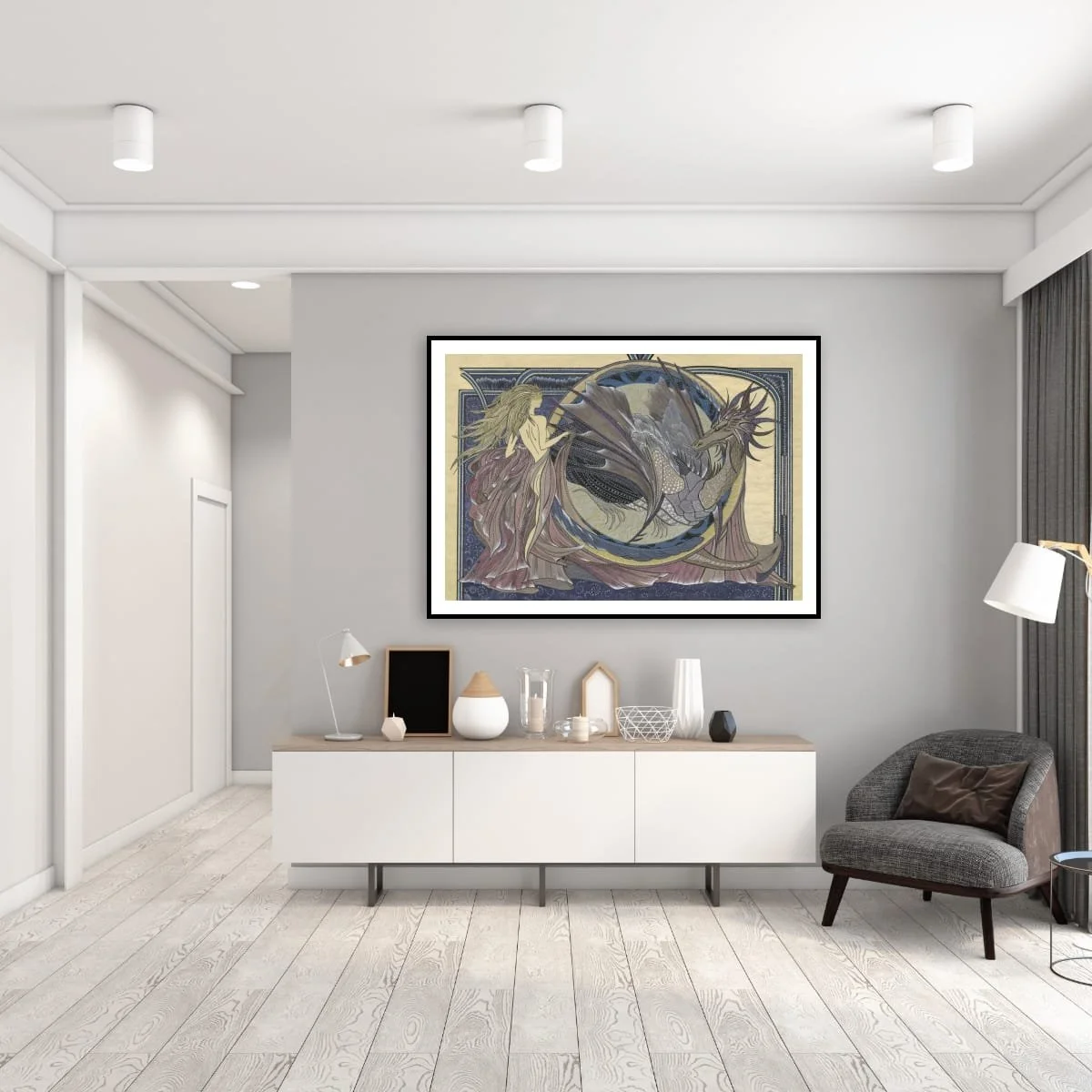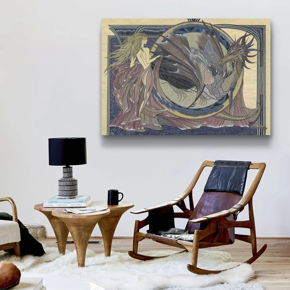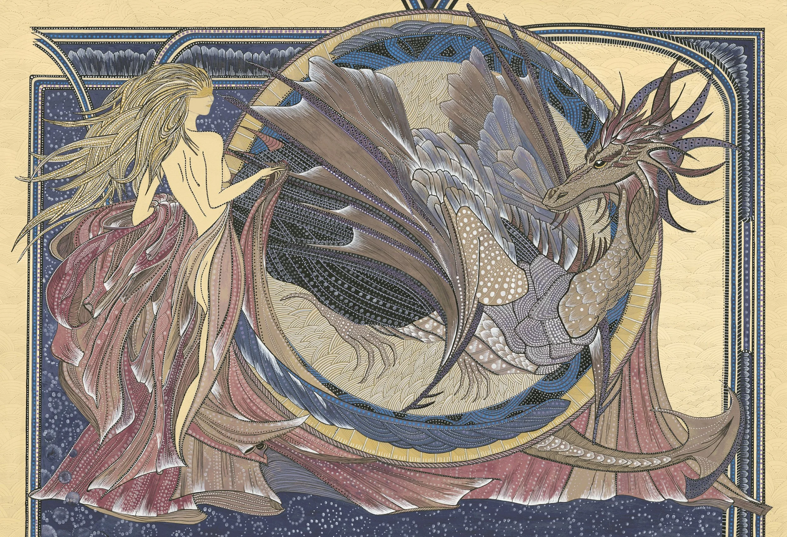 A graceful, ethereal woman stands beside the dragon, her flowing golden hair and gown seamlessly blending into the ornate, swirling forms that define the composition. The scene is set against a richly detailed background of Art Nouveau-inspired motifs and a starry night sky, all enclosed by decorative borders in deep blue and gold.