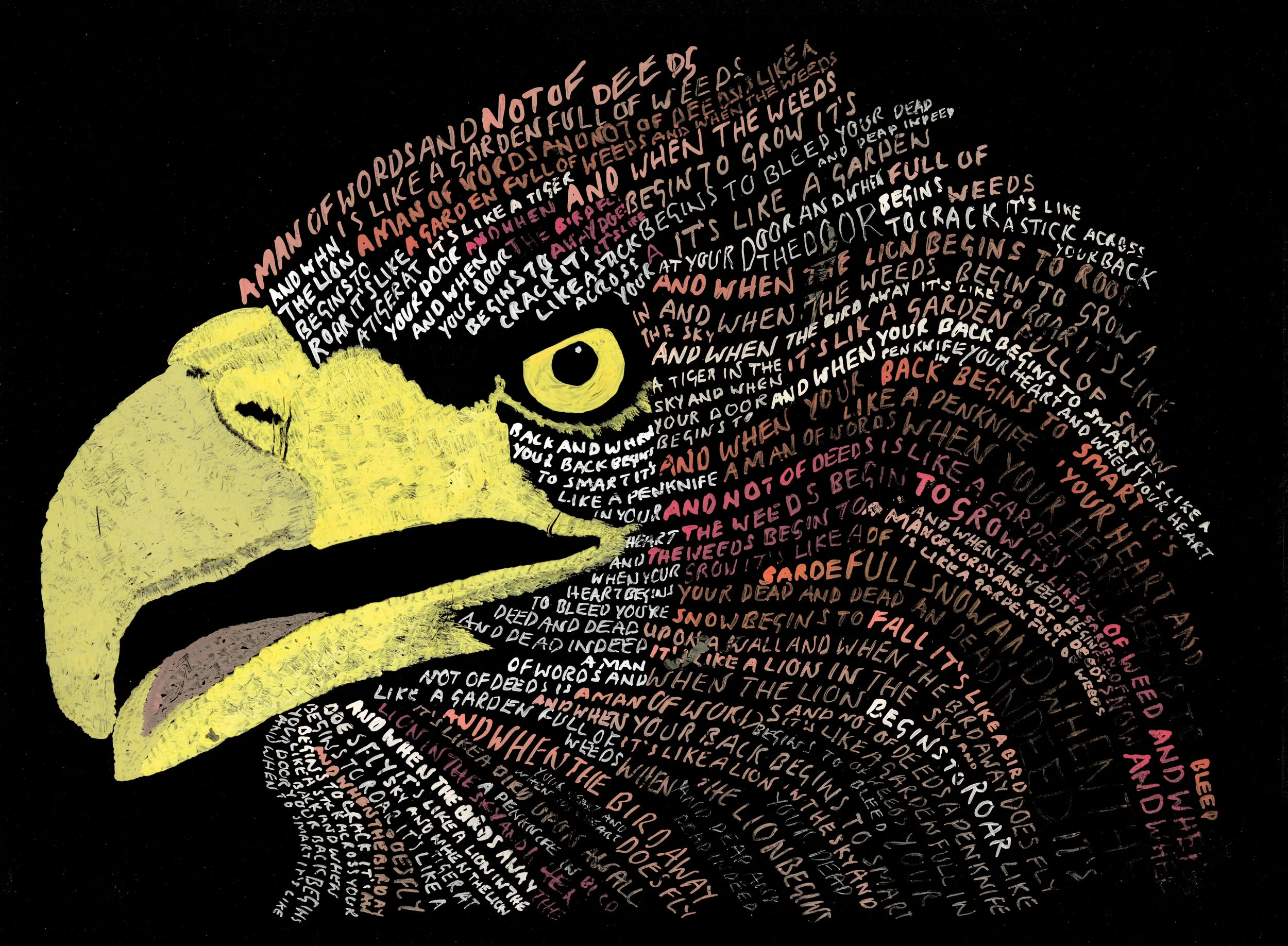 The bold use of color—contrasting luminous yellows and ochres against a deep black ground—imbues the eagle with a sense of majesty and vigilance. The text, rendered in varying shades and sizes, creates a sense of movement and depth, echoing the complexity and intelligence of the bird itself.