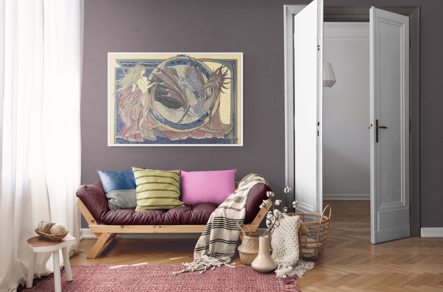 Step into a world of enchantment with this exquisite fantasy illustration, where myth and elegance intertwine. This original artwork features a majestic dragon, meticulously rendered with intricate scales and feathered wings in a harmonious palette of muted purples, silvers, and golds. The dragon is gracefully coiled within a circular frame, exuding both strength and serenity.