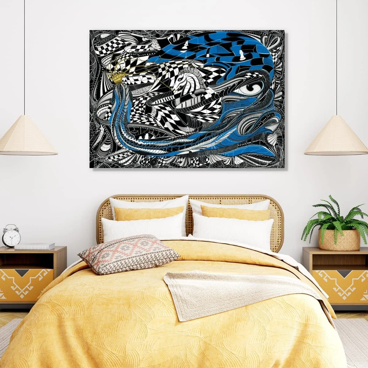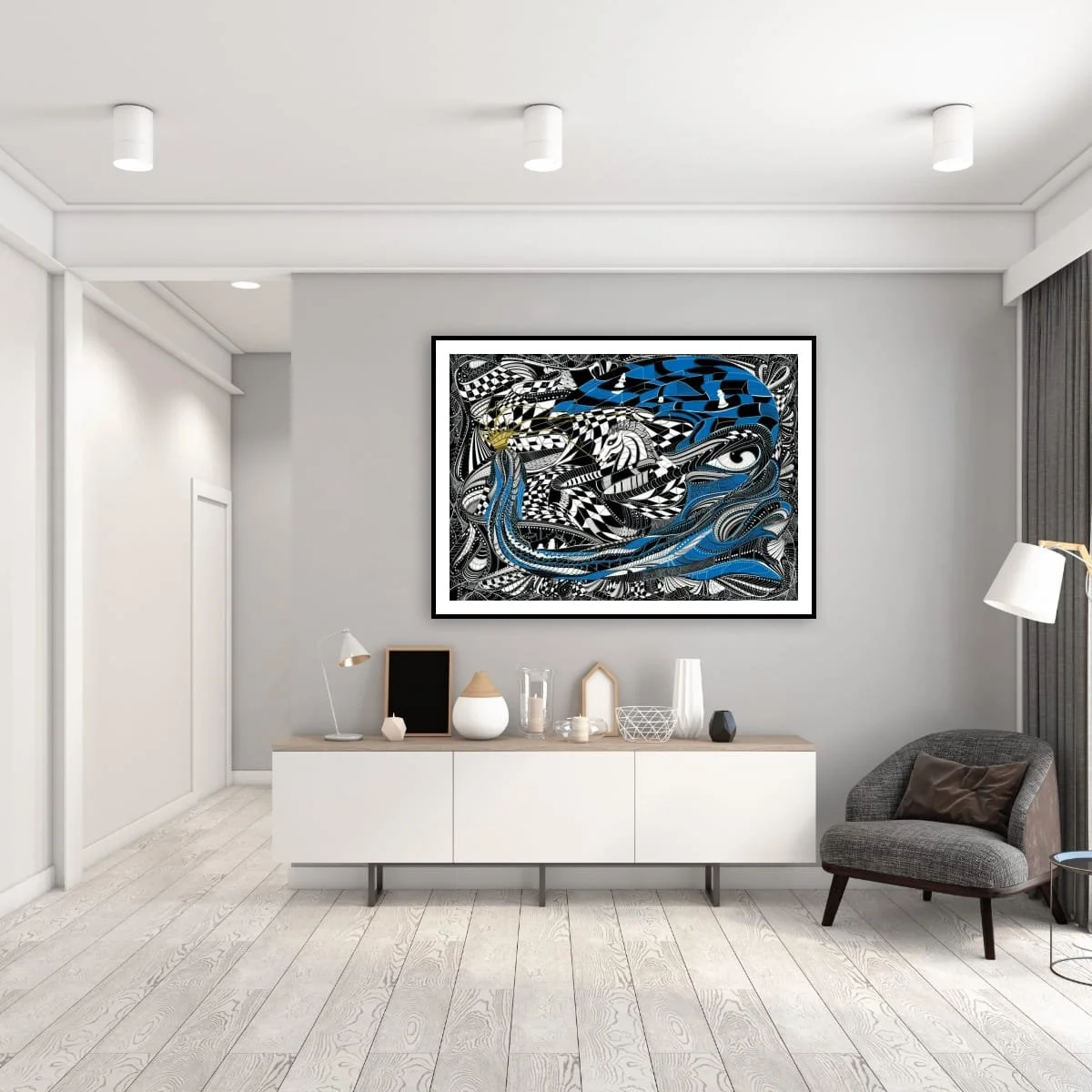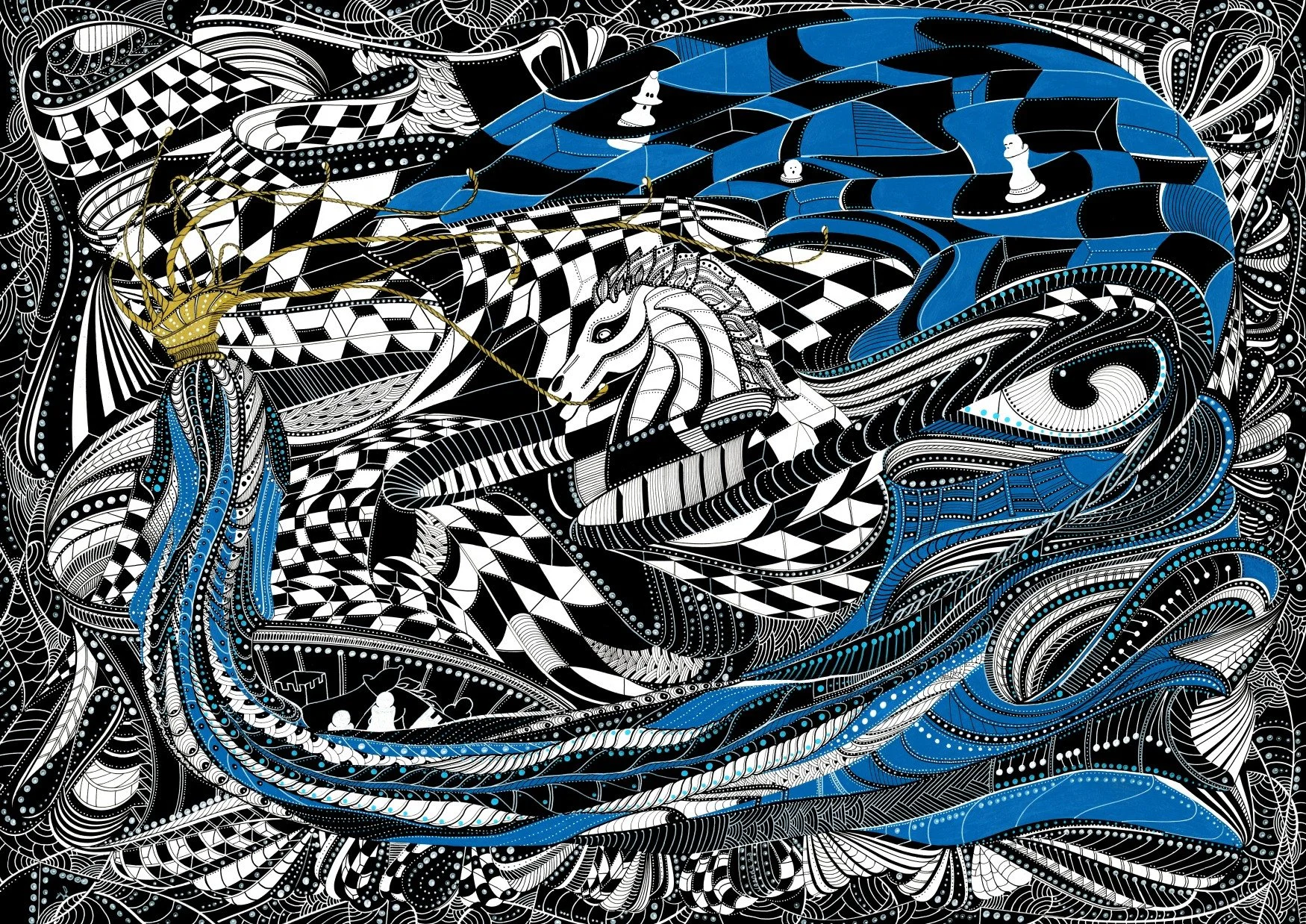 ‘Queen’s Gambit’ is a visually arresting work that reimagines the timeless strategy and drama of chess. This intricate composition weaves together bold black-and-white geometry with fluid, organic forms and striking accents of cerulean blue and gold. At its heart, the piece features a powerful, stylised queen crowned in gold, her presence commanding the swirling chessboard landscape, while a vigilant knight emerges from the patterned depths—both figures poised in a moment of calculated tension.