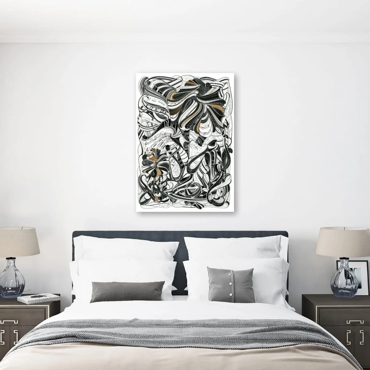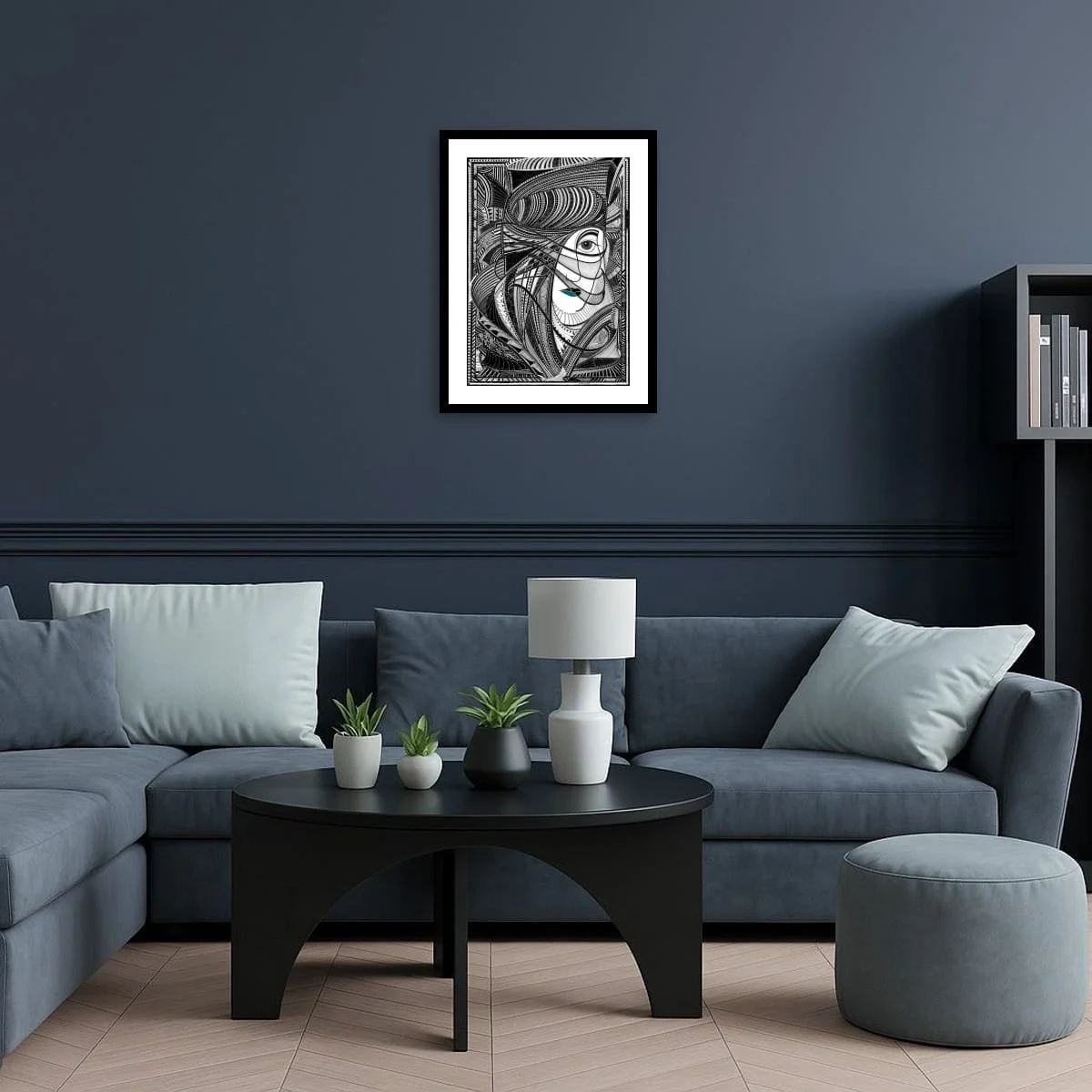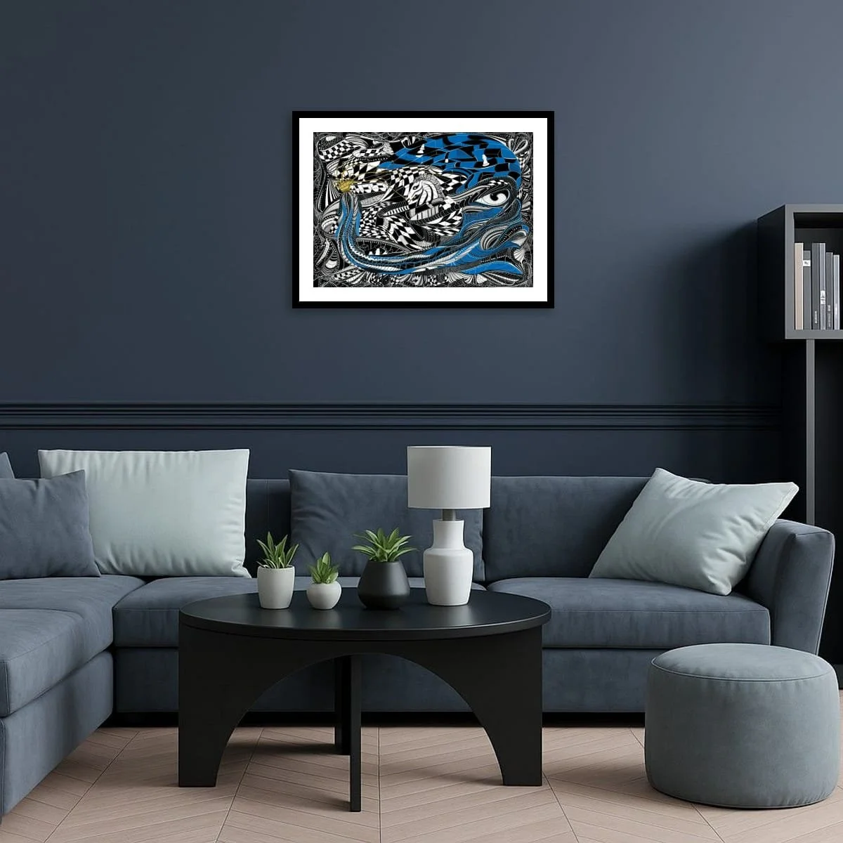 ‘Queen’s Gambit’ is a visually arresting work that reimagines the timeless strategy and drama of chess. This intricate composition weaves together bold black-and-white geometry with fluid, organic forms and striking accents of cerulean blue and gold. At its heart, the piece features a powerful, stylised queen crowned in gold, her presence commanding the swirling chessboard landscape, while a vigilant knight emerges from the patterned depths—both figures poised in a moment of calculated tension.