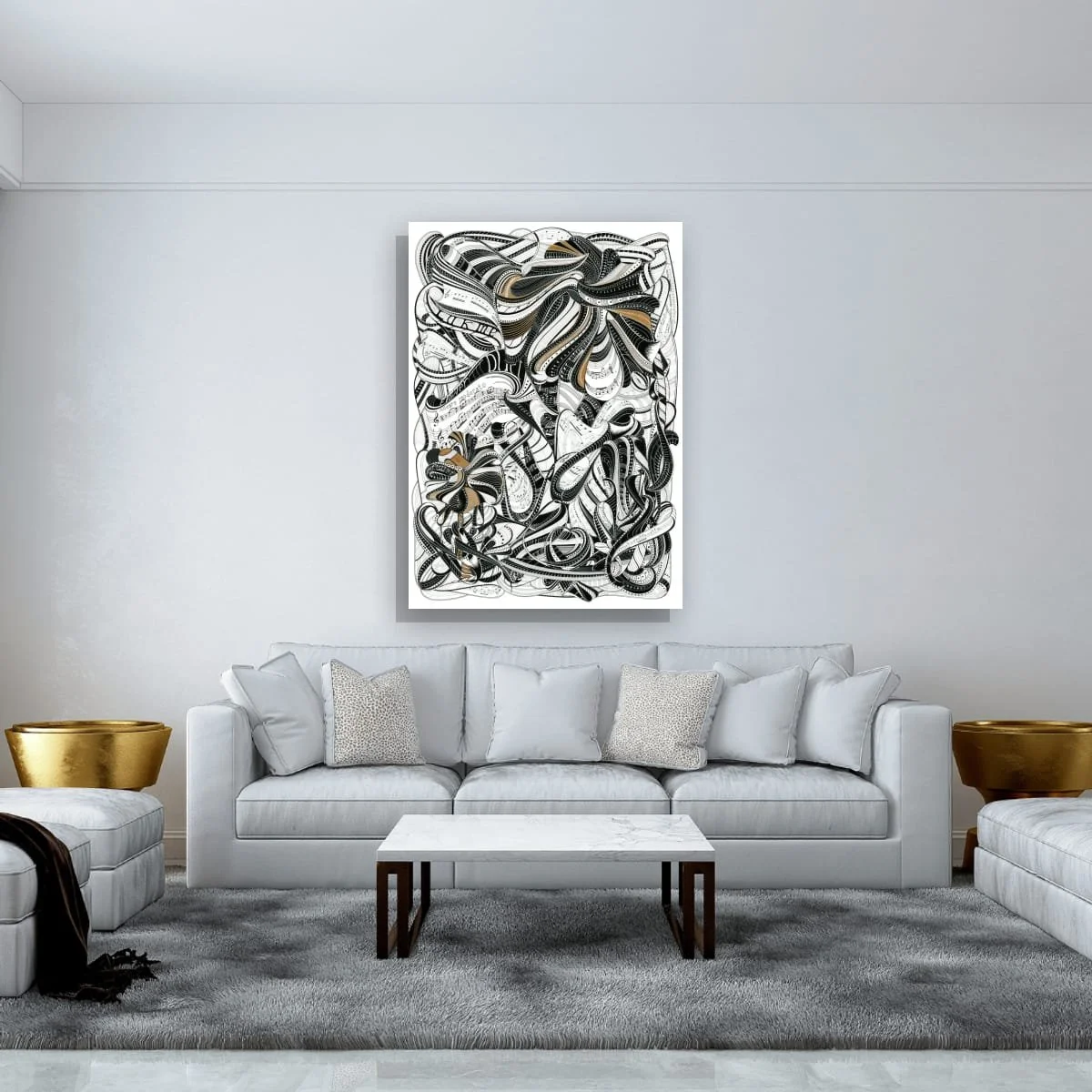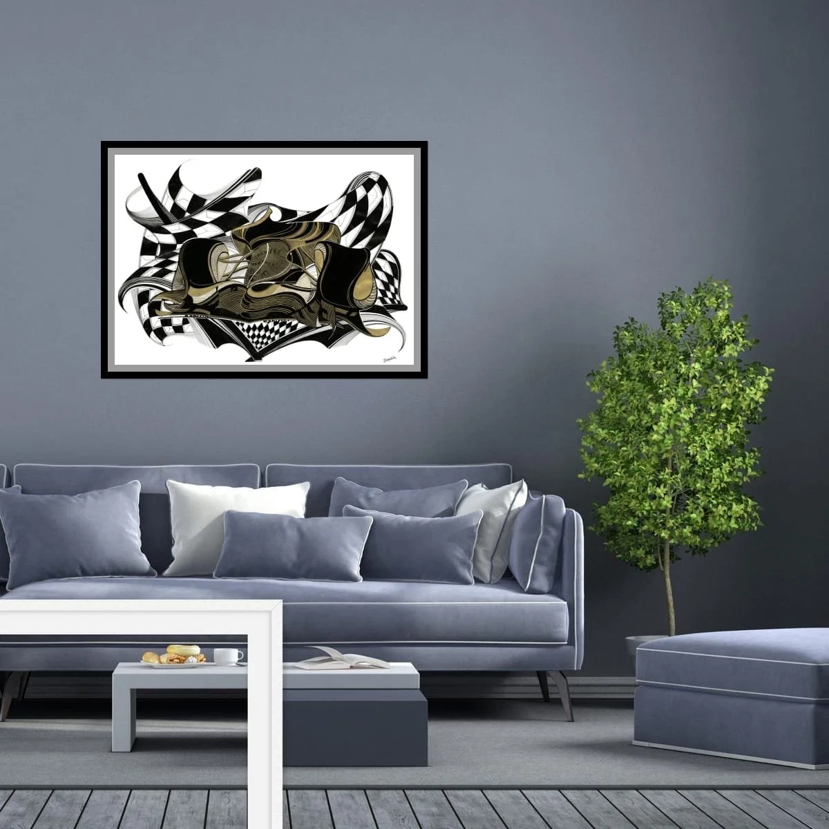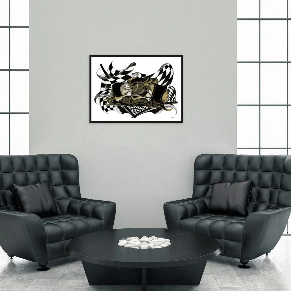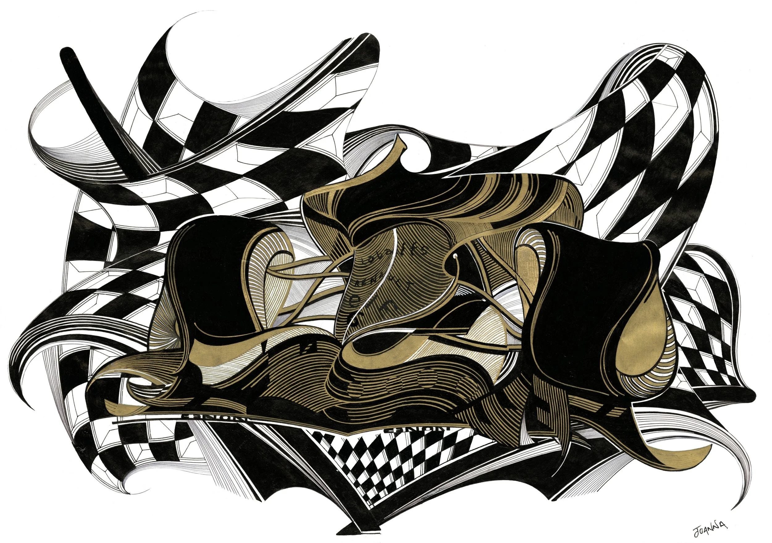Executed in a sophisticated palette of black, white, and metallic gold, ‘La Fin’ balances graphic intensity with elegant linework. The intricate layering of curves and geometric patterns creates a sense of movement and energy, immersing the viewer in the tension and triumph of motorsport’s most celebrated moments.