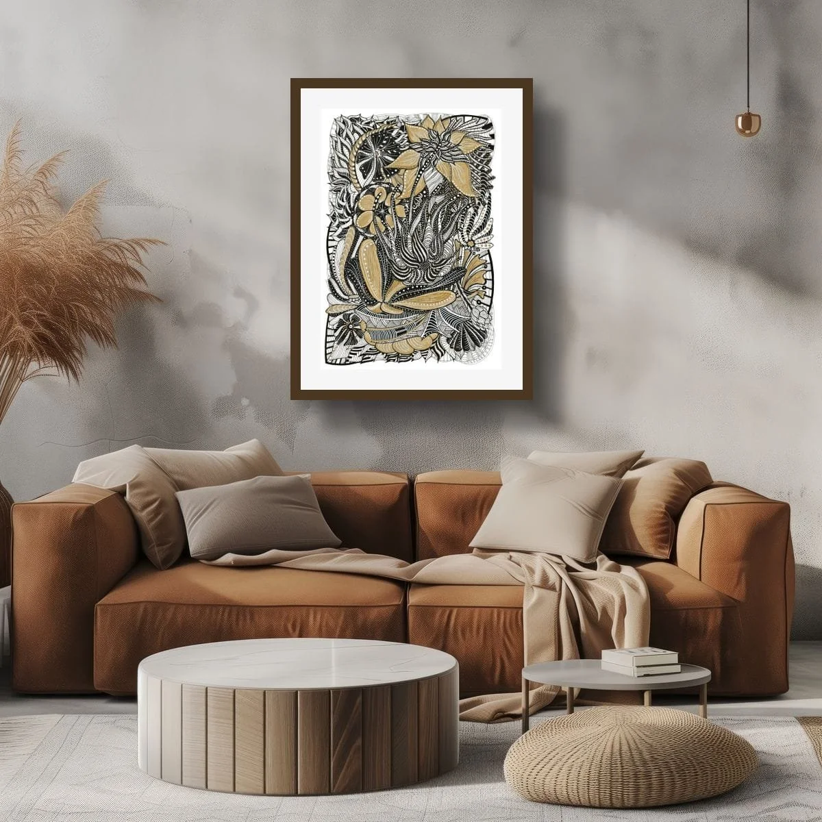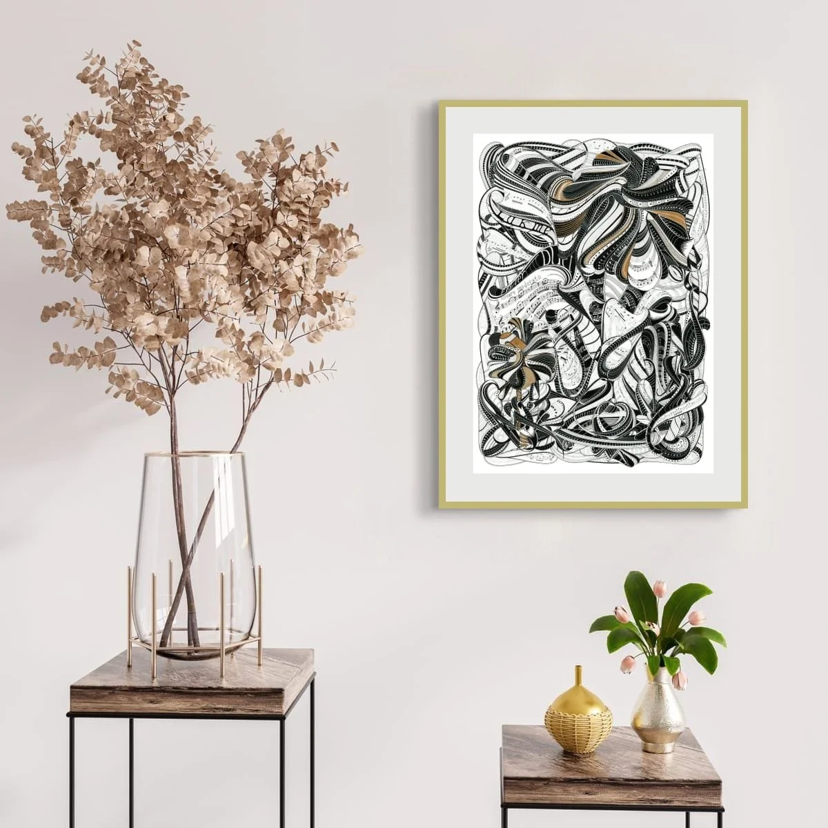 The interplay of gold and black ink creates a dynamic tension—evoking both the opulence of illuminated manuscripts and the boldness of contemporary graphic art. Each botanical element is layered and intertwined, suggesting the complexity and abundance of nature, while the gold accents catch the light, imbuing the work with a sense of luxury and timelessness.