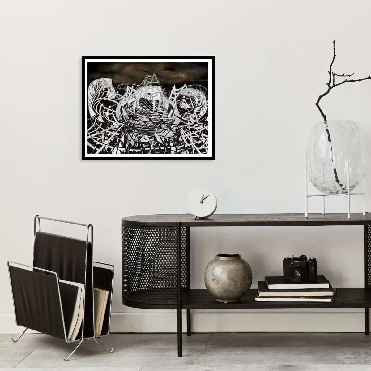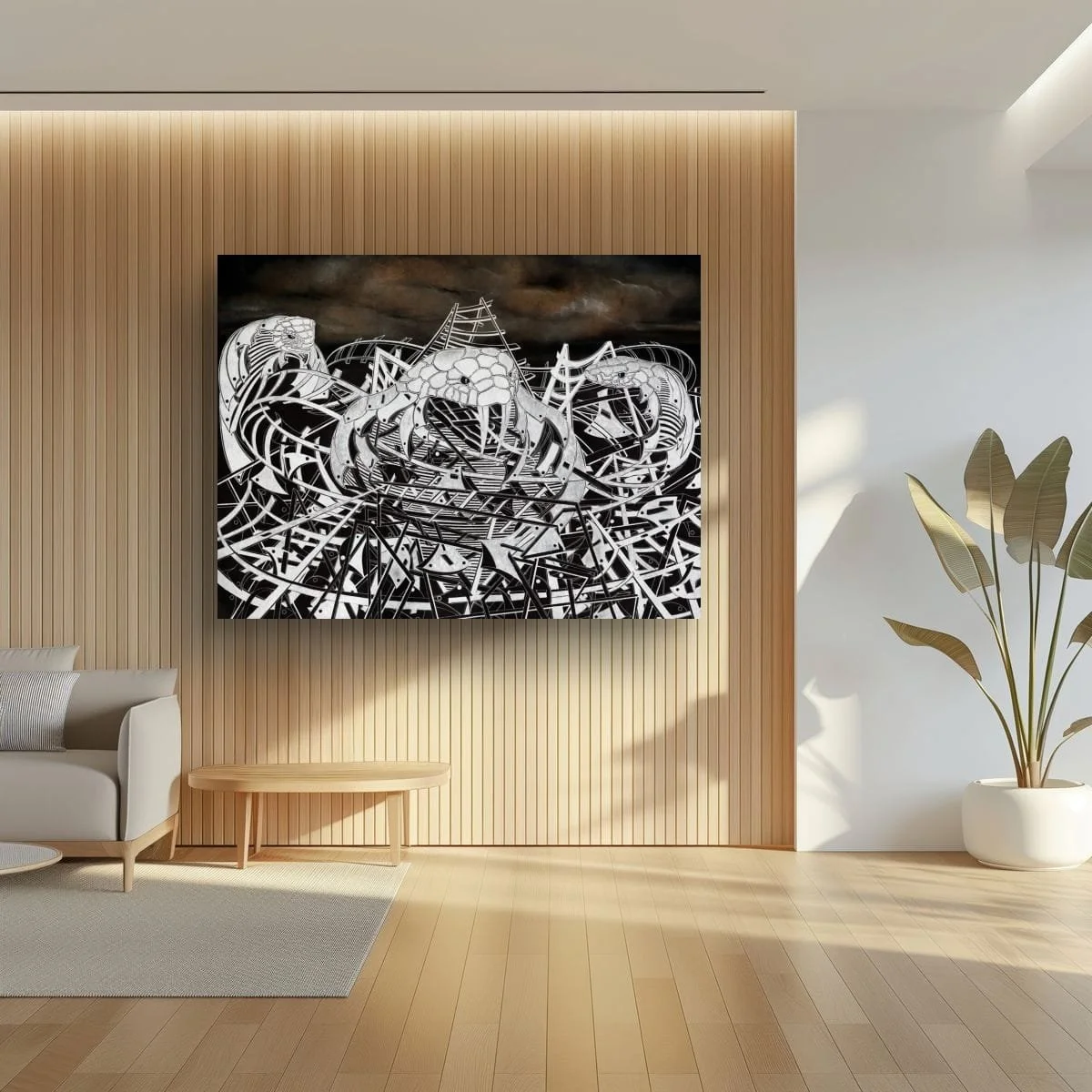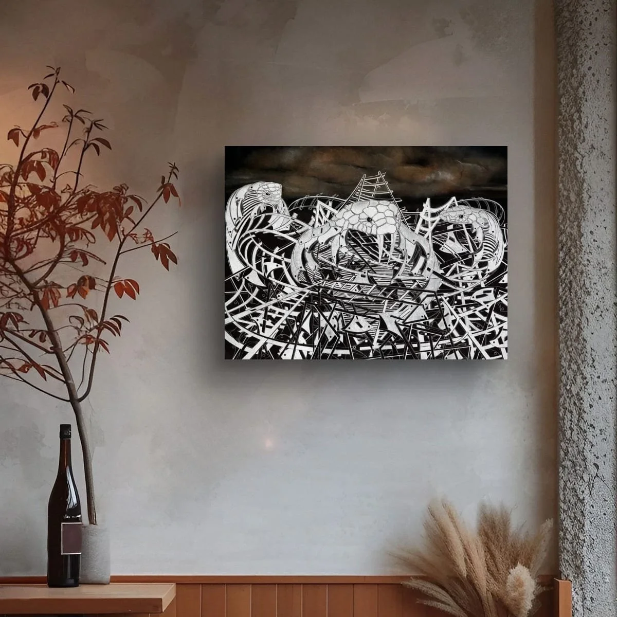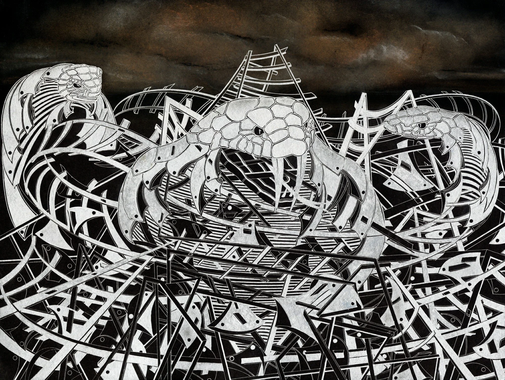 The scene is dominated by a labyrinth of interlocking tracks and twisted structures, rendered in stark black and white with razor-sharp precision. Emerging from this mechanical tangle are three sinister serpent forms, their bodies seamlessly integrated with the architecture of the ride. The serpents’ cold, unblinking eyes and menacing fangs evoke a sense of imminent danger, amplifying the work’s underlying tension.