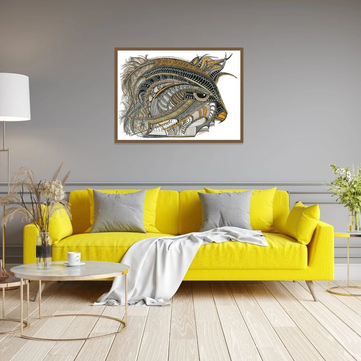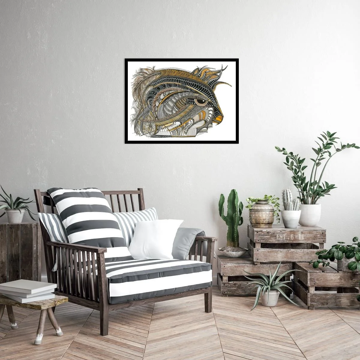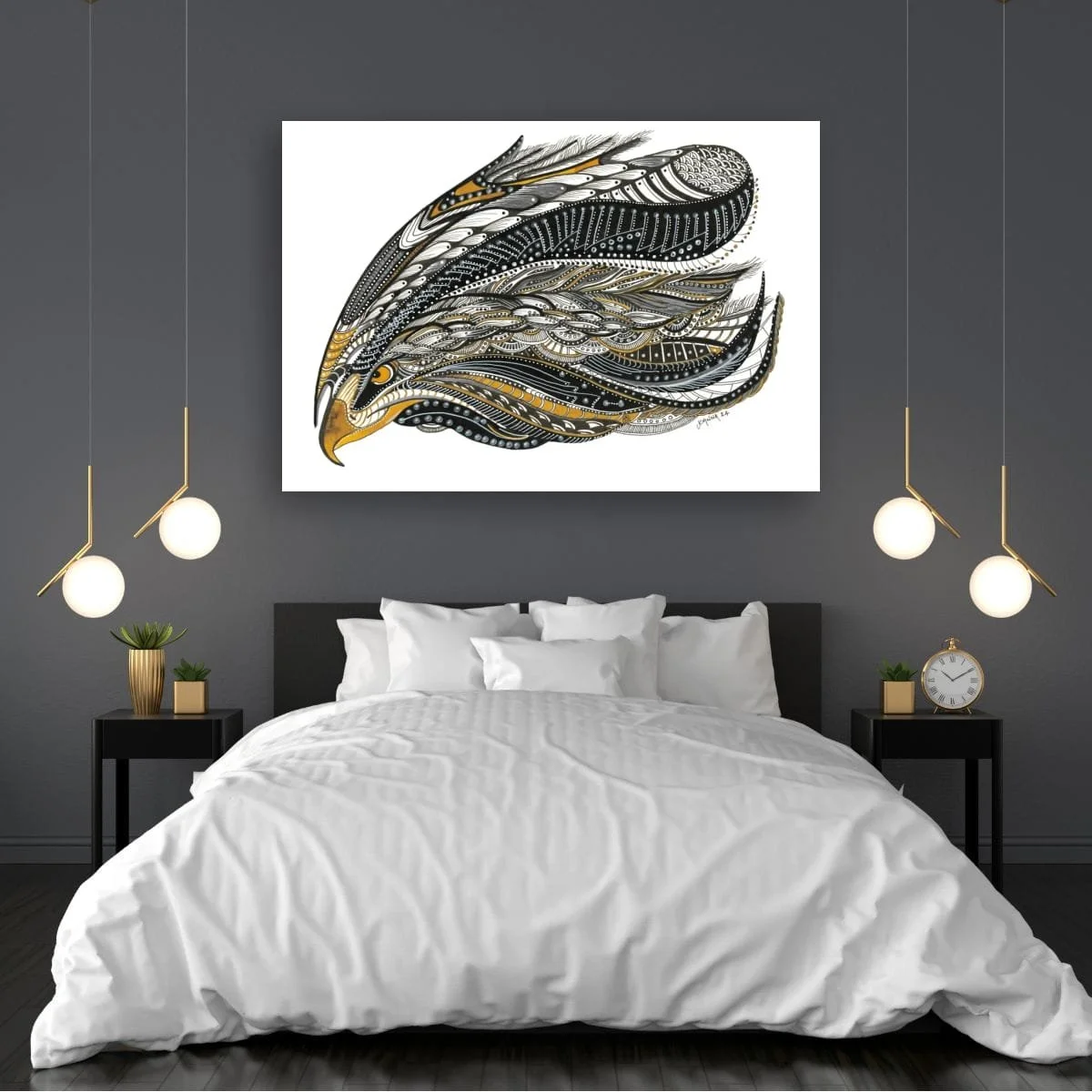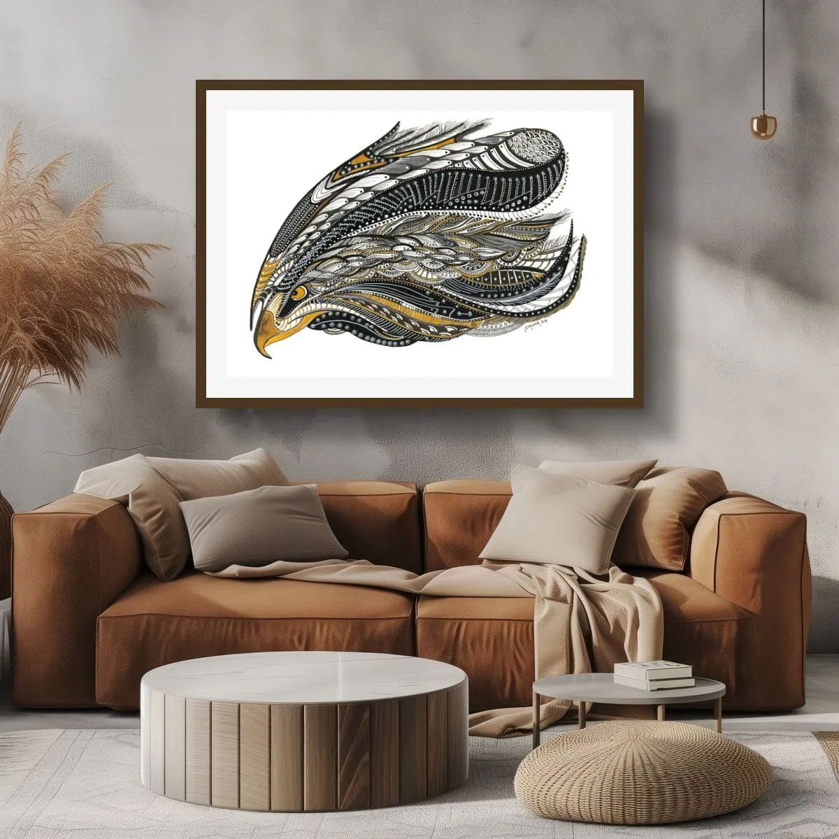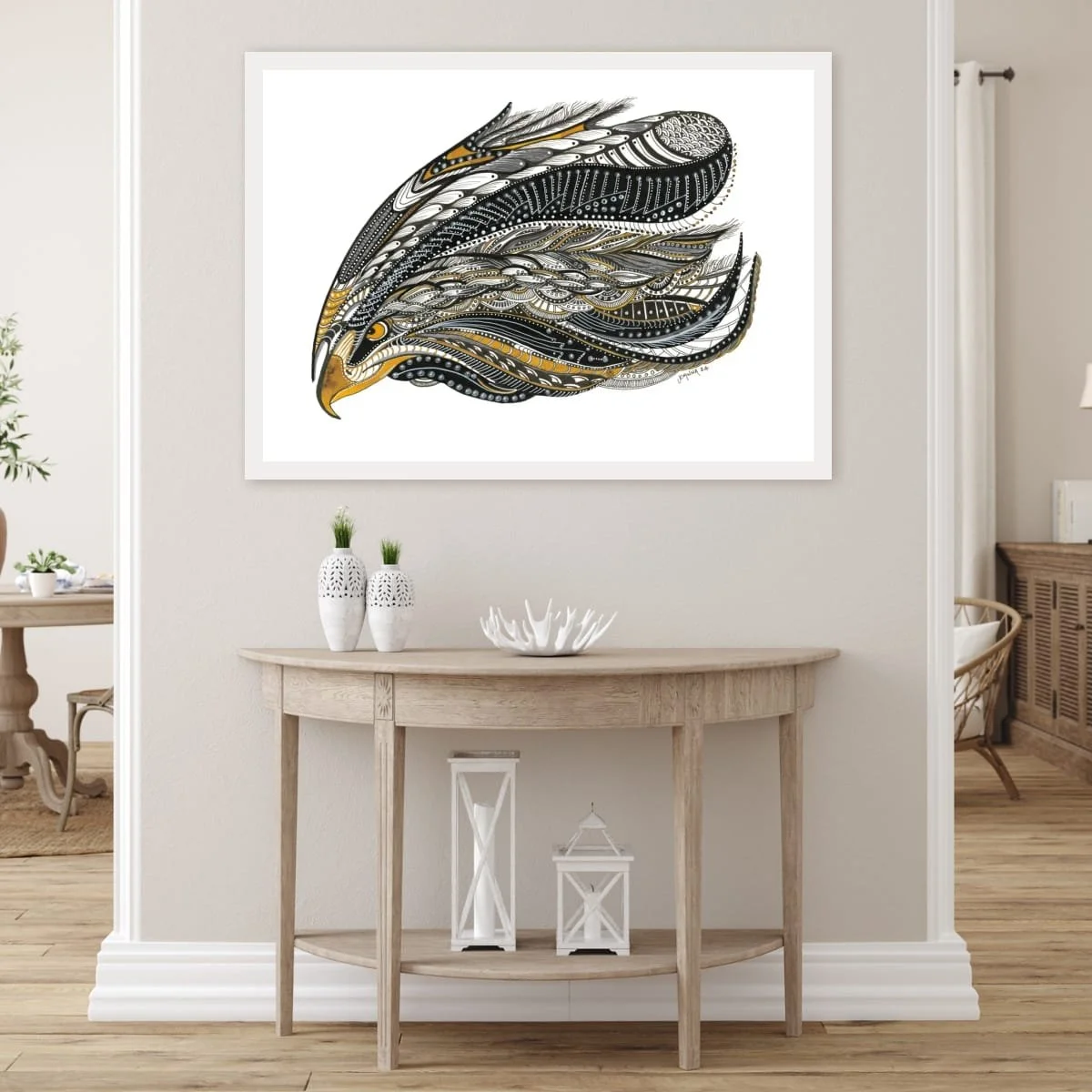 Joanna’s technique combines fine linework, layered patterns, and subtle metallic accents to create a sense of movement and dimensionality. The stylised form is both bold and elegant, inviting viewers to explore the interplay of organic motifs and abstract design. The golden eagle’s piercing gaze anchors the composition, embodying strength, clarity, and the spirit of the wild.