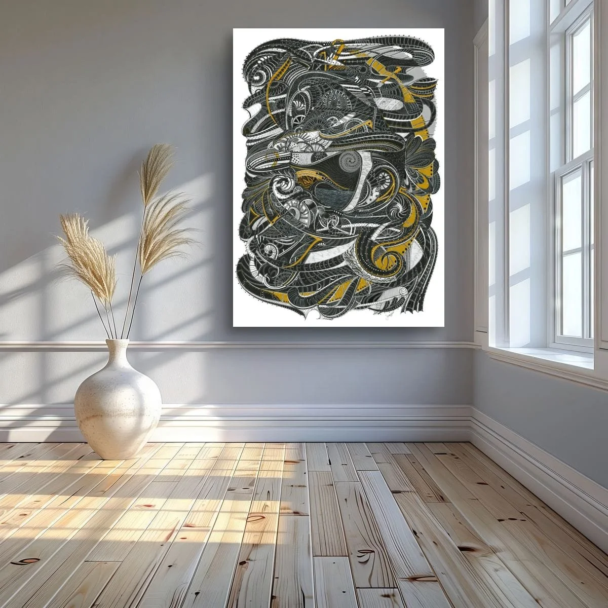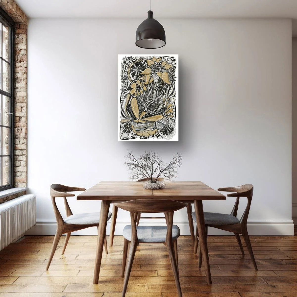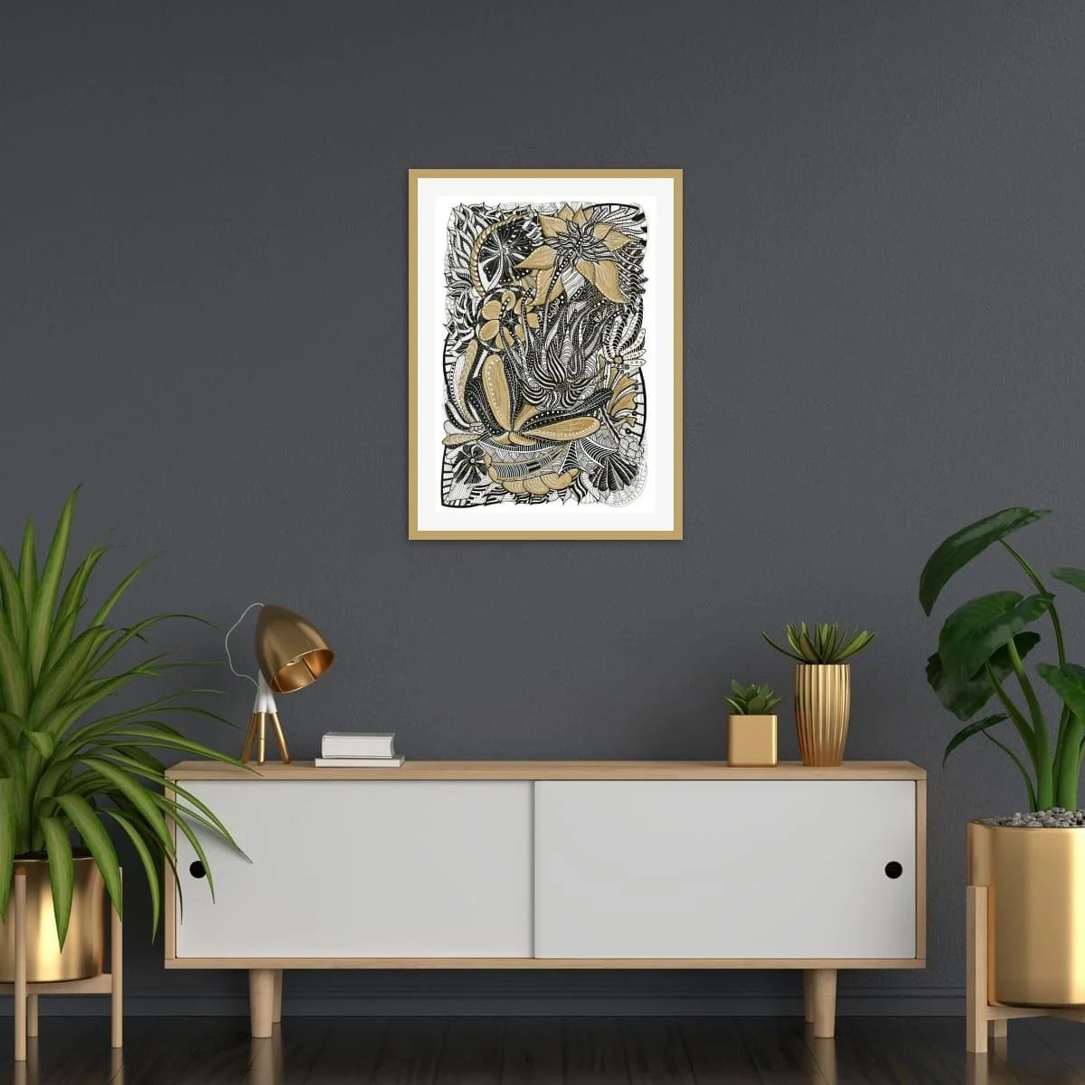 ‘Gilded Botanica’ is a celebration of organic form and ornamental detail, rendered in luminous gold and deep black ink. This piece draws the viewer into a lush, fantastical garden where every petal, leaf, and tendril is meticulously articulated with rhythmic linework and shimmering highlights.