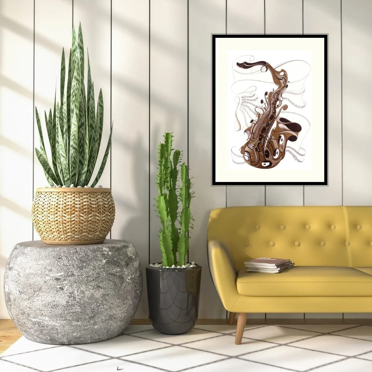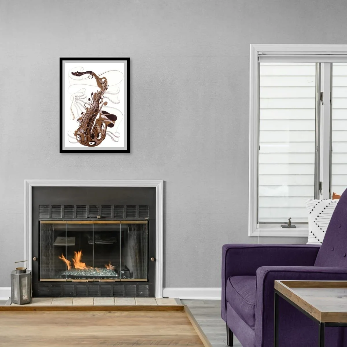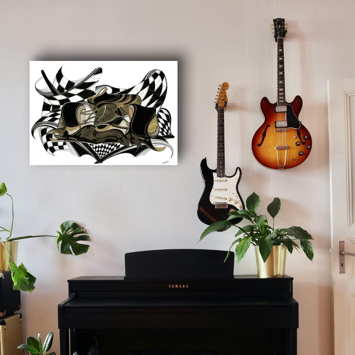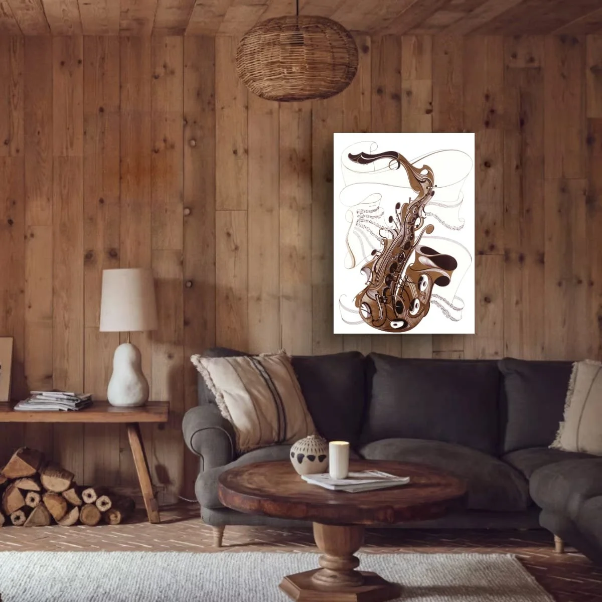 The composition is both dynamic and elegant: sweeping curves and intricate patterns suggest the flow of sound waves, while the stylised saxophone becomes a visual focal point, radiating energy across the canvas. The interplay of metallic gold against deep, contrasting tones creates a sense of depth and sophistication, inviting viewers to experience the artwork both visually and emotionally.