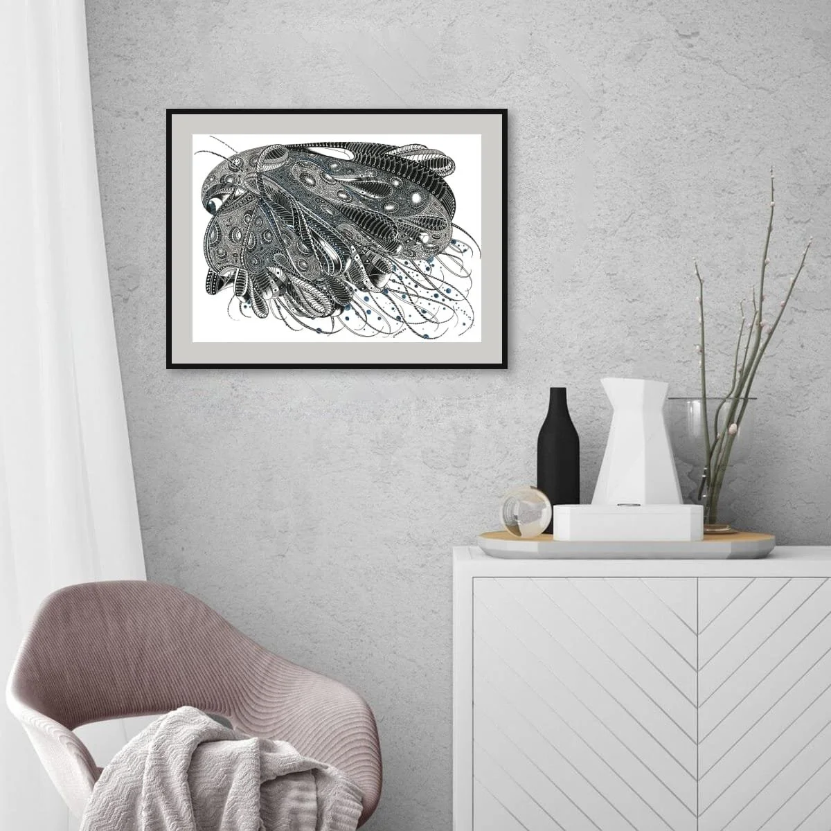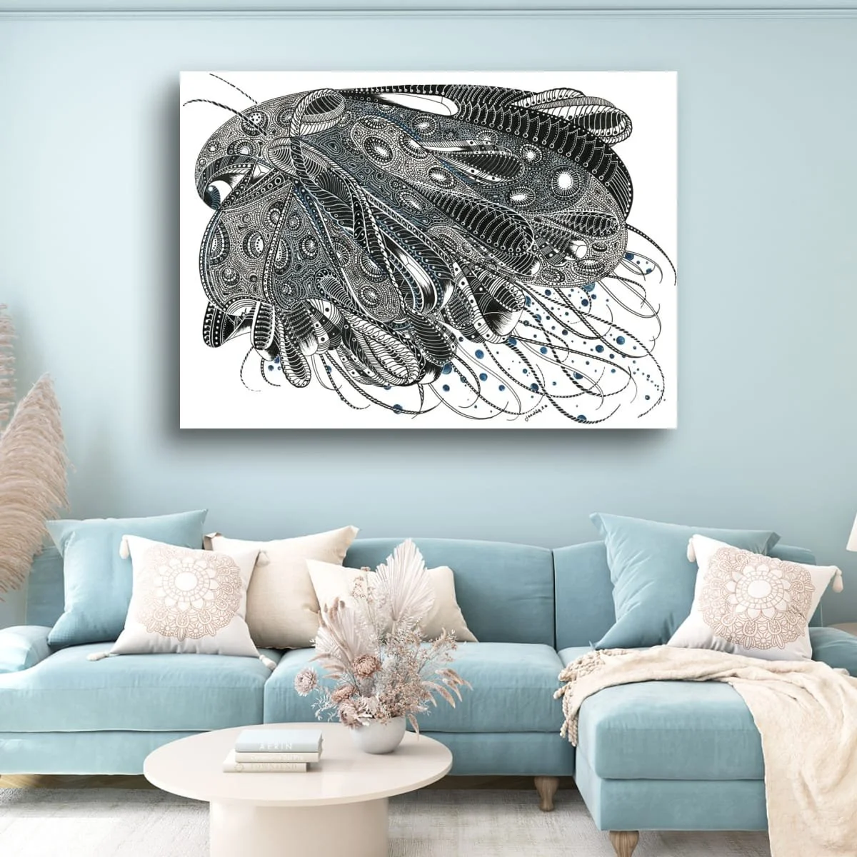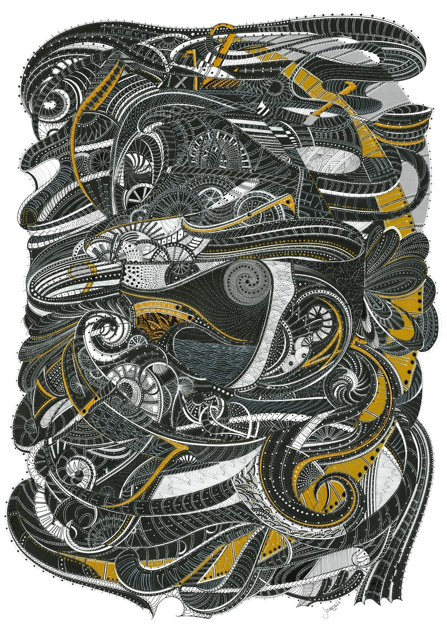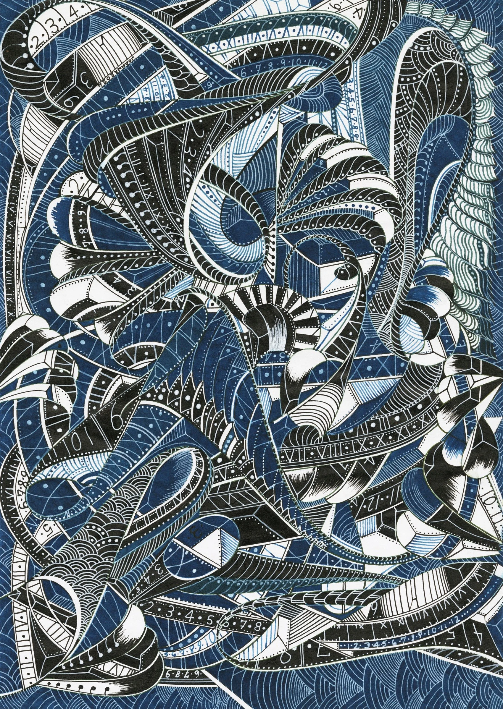 ‘Beneath The Waves’ is a captivating exploration of marine mystery, rendered in intricate pen and ink with subtle blue accents. This piece draws the viewer into a mesmerizing tangle of organic forms and rhythmic patterns, evoking the enigmatic life and movement found in the ocean’s depths. Each swirling line and meticulously detailed motif suggests the hidden vitality and complexity of underwater worlds, inviting the eye to wander and discover new details with every viewing.