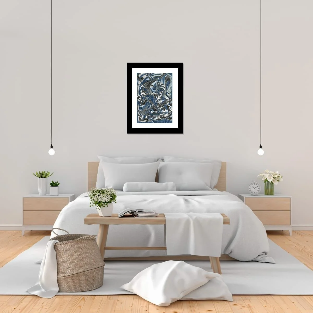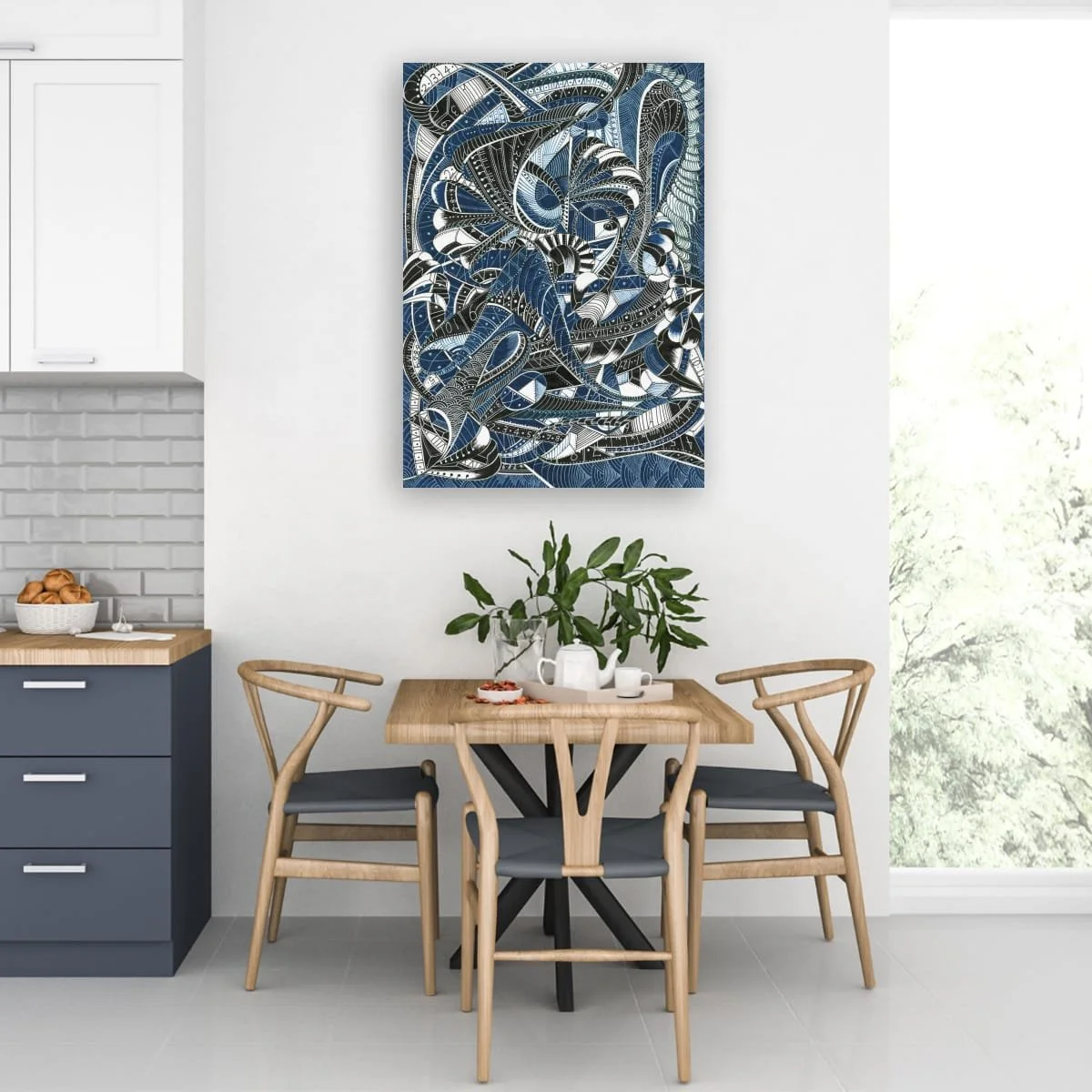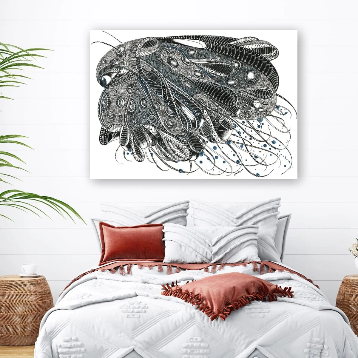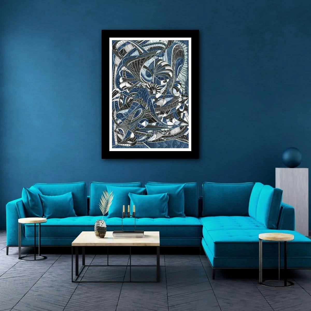 ‘Beneath The Waves’ is a captivating exploration of marine mystery, rendered in intricate pen and ink with subtle blue accents. This piece draws the viewer into a mesmerizing tangle of organic forms and rhythmic patterns, evoking the enigmatic life and movement found in the ocean’s depths. Each swirling line and meticulously detailed motif suggests the hidden vitality and complexity of underwater worlds, inviting the eye to wander and discover new details with every viewing.