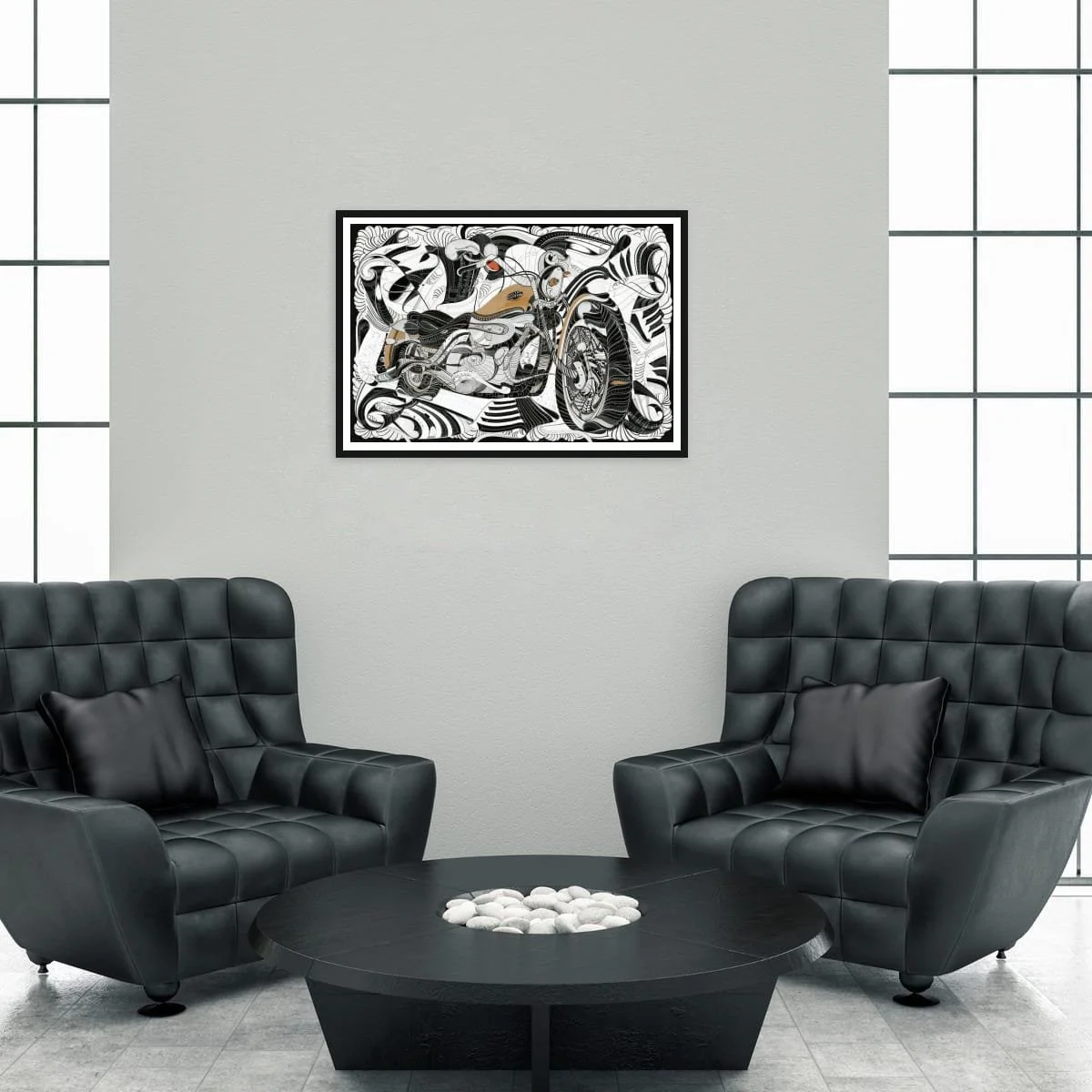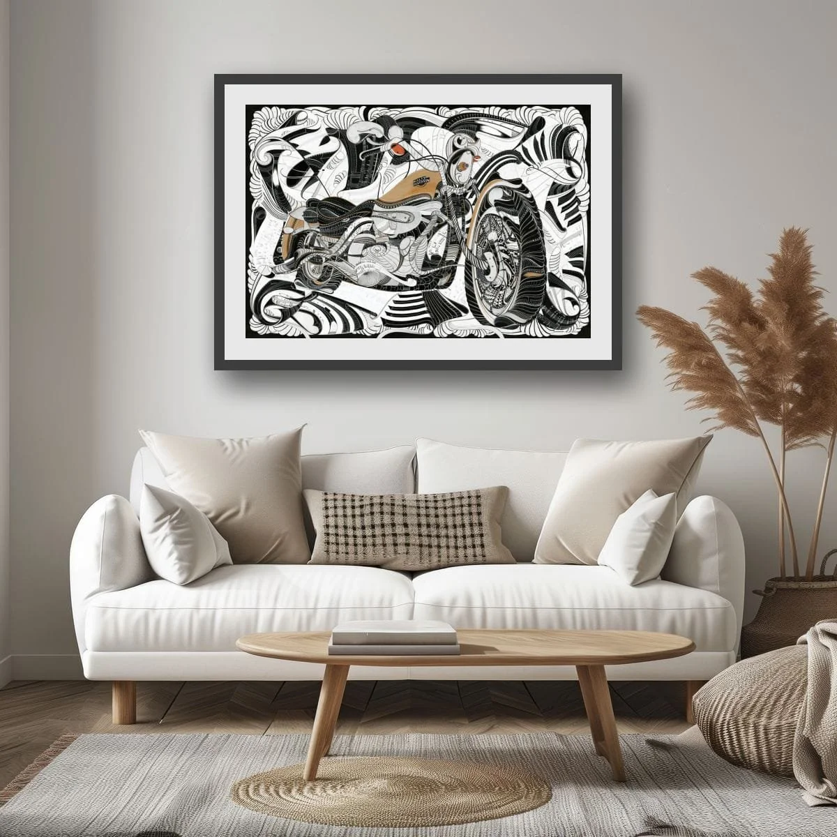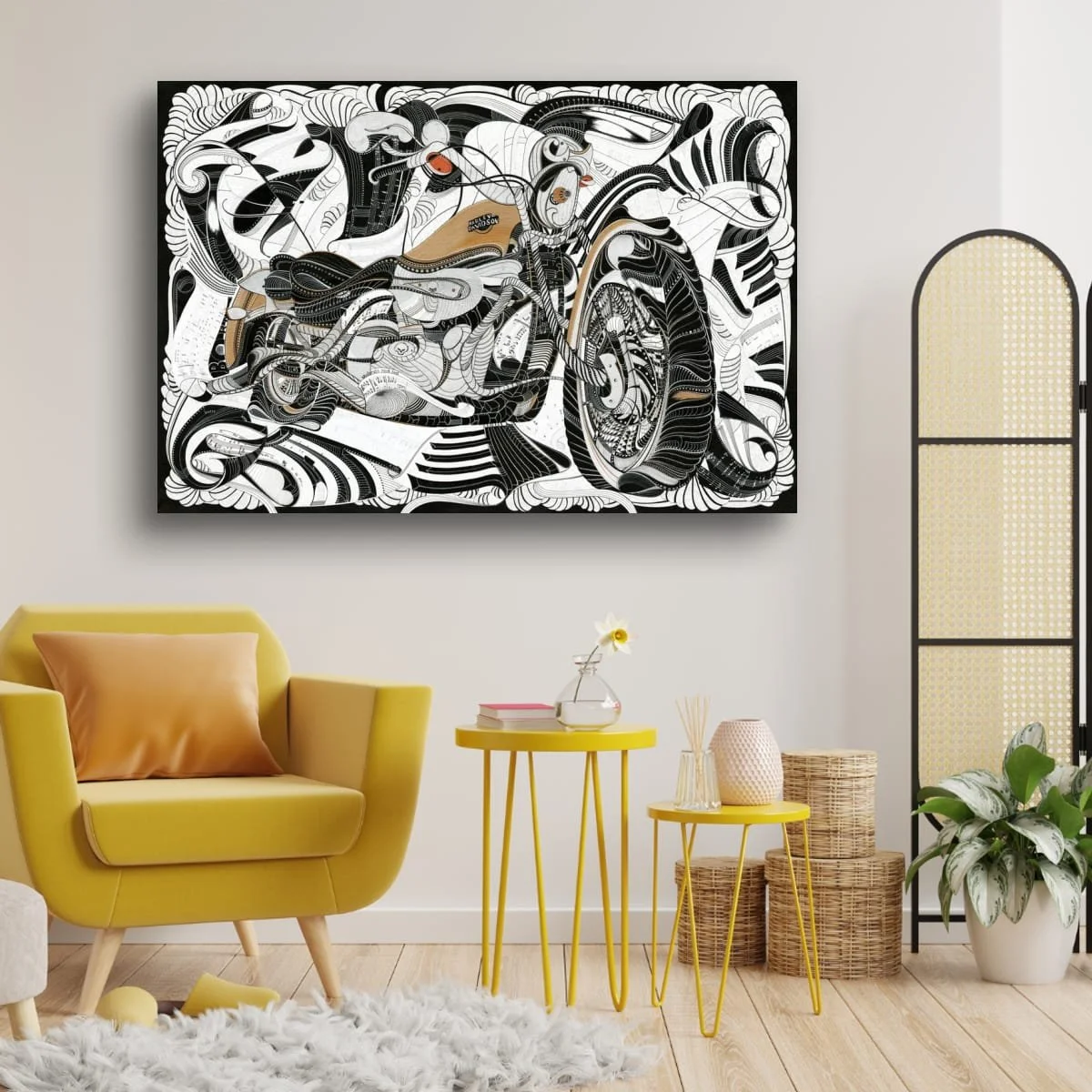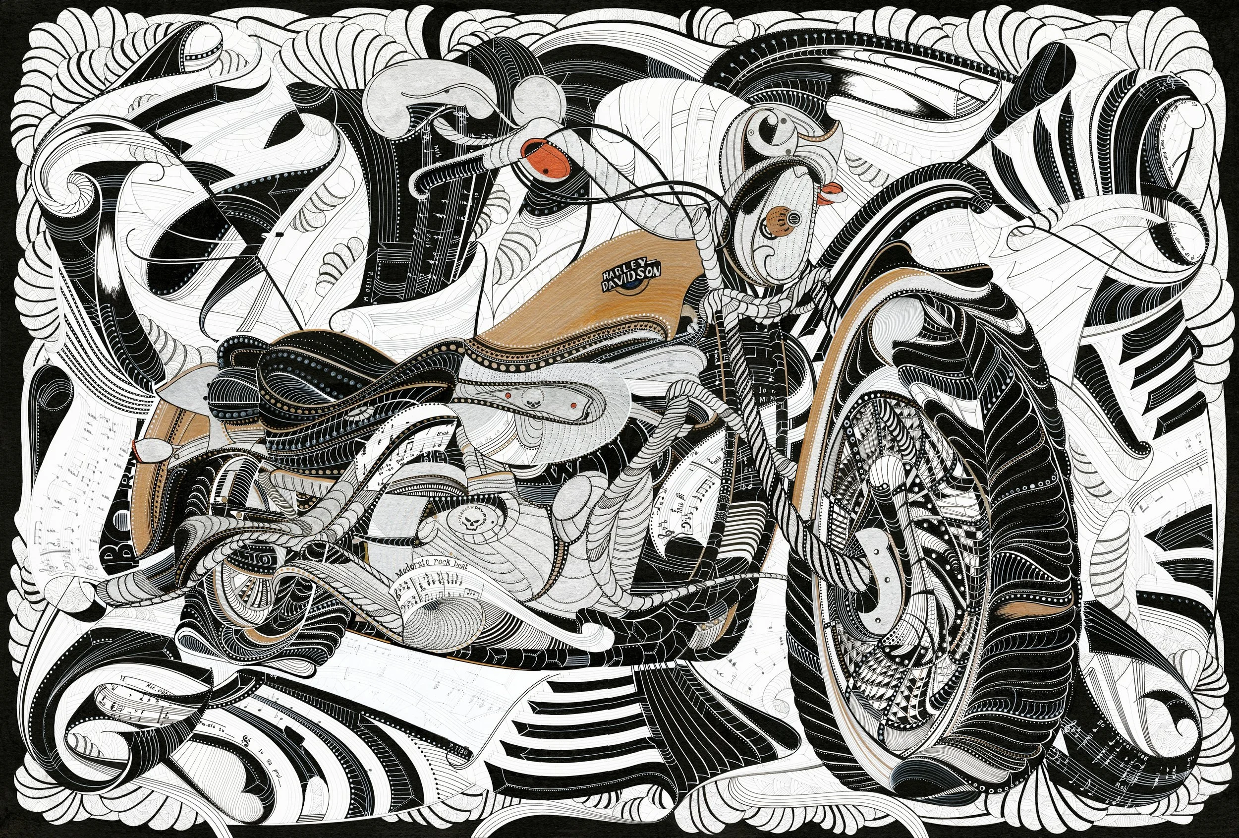 "HARLEY" is a bold homage to the legendary Harley Davidson motorbike, fusing the raw spirit of the open road with the iconic energy of Steppenwolf’s "Born to be Wild." This dynamic composition pulses with movement and freedom, its intricate linework and textured forms echoing the chrome, leather, and thunderous power of classic motorcycle culture.