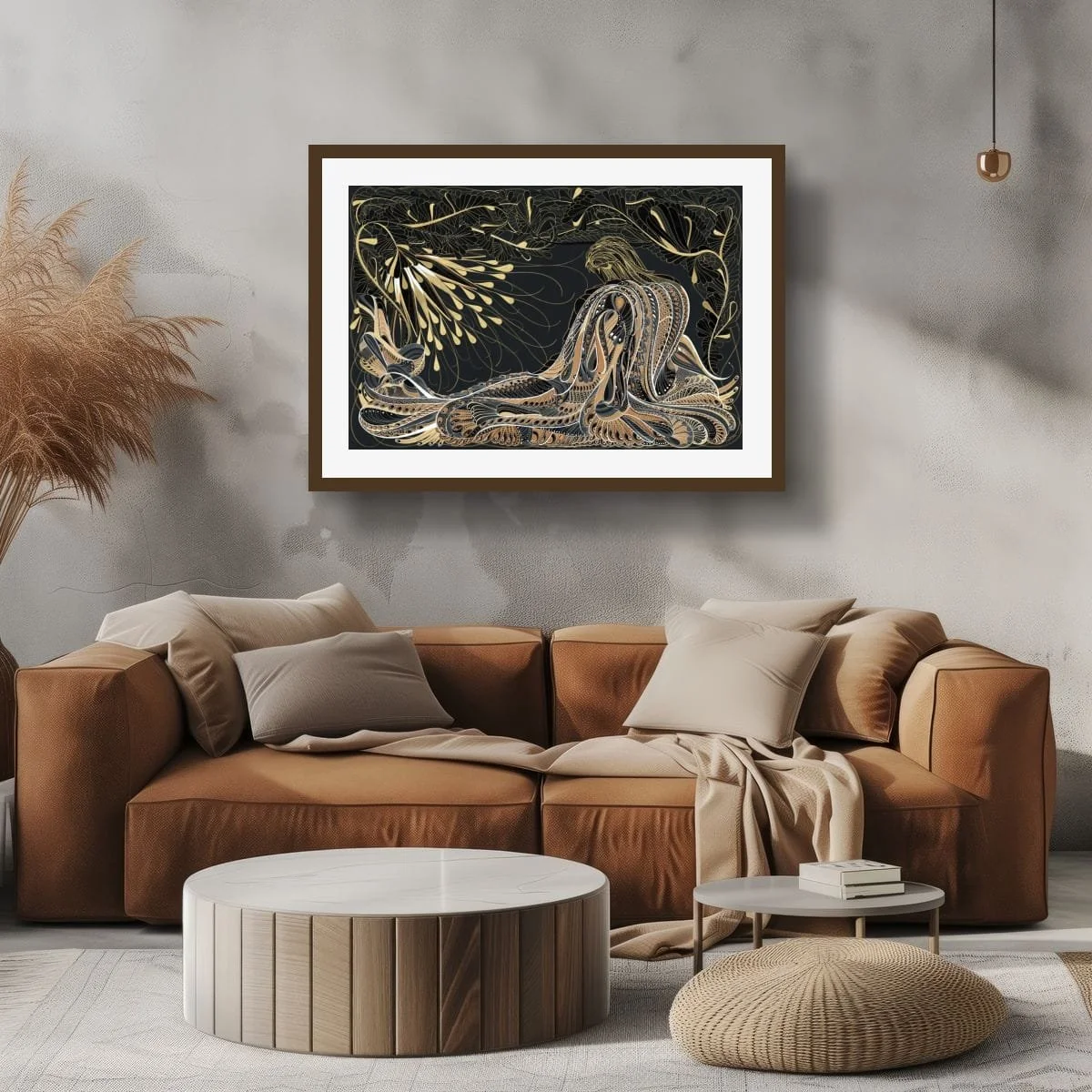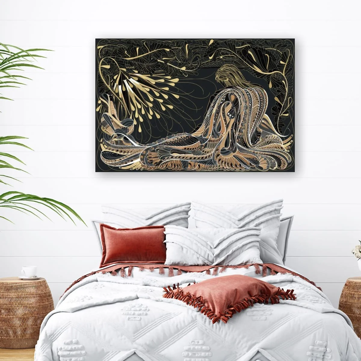 ‘The Guardian (at sunrise)’ is a captivating, large-scale pen and ink work that masterfully blends intricate detail with luminous elegance. The composition features a stylised, contemplative angelic figure—an embodiment of strength and serenity— enveloped in a cascade of flowing lines and organic motifs, rendered in a sophisticated palette of black, gold, and copper.