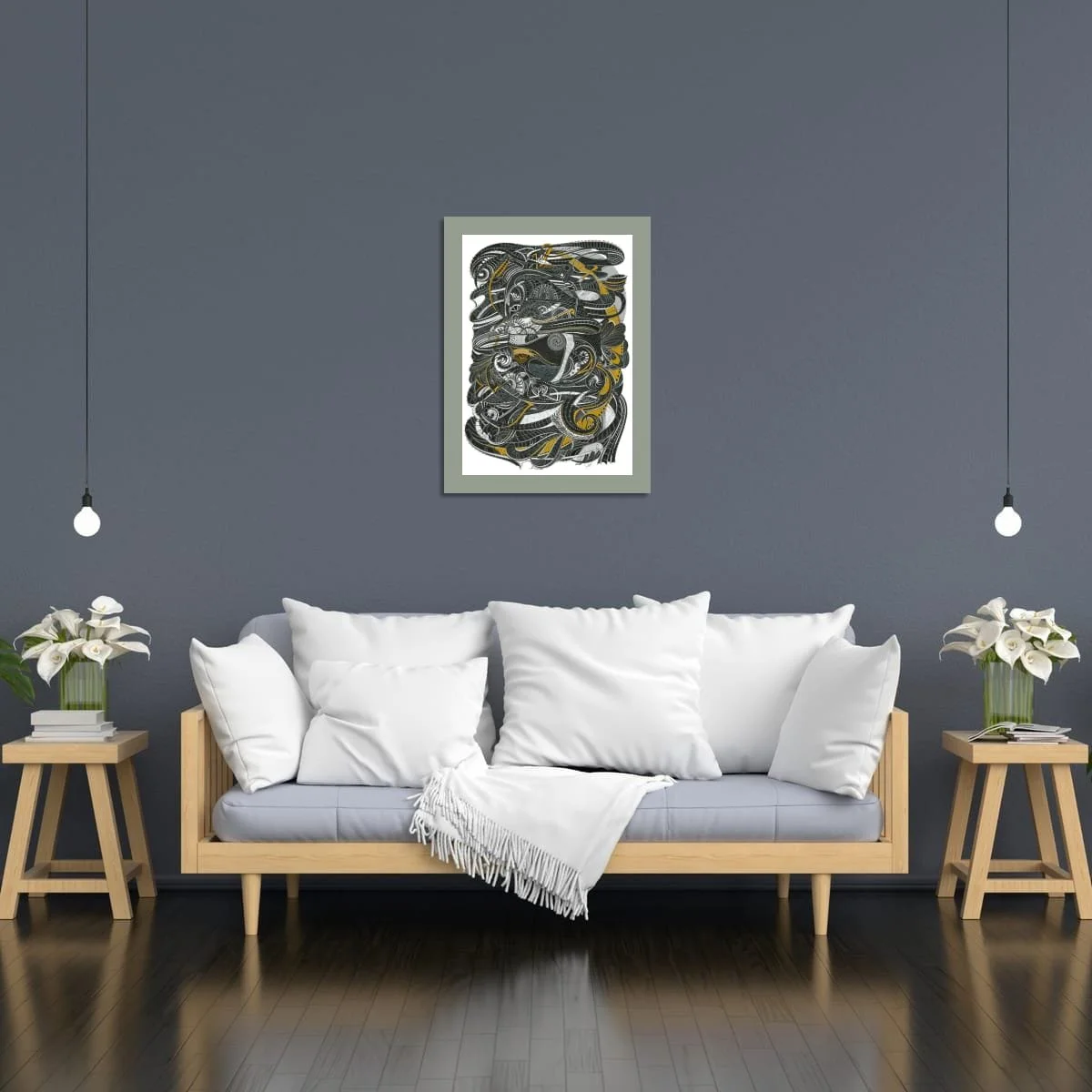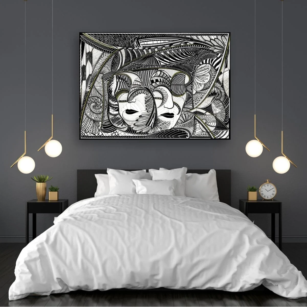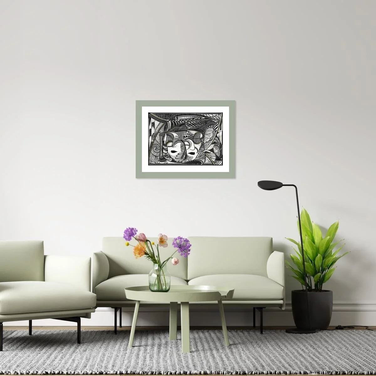 ‘In Two Minds’ is an ethereal exploration of duality and identity, rendered in a monochrome palette with subtle sage green accents. At the heart of the composition, two enigmatic faces—twins—emerge from a labyrinth of intricate linework and organic motifs. The mirrored forms evoke both unity and contrast, inviting viewers to contemplate the complexities of self, perception, and the delicate balance between opposing forces.