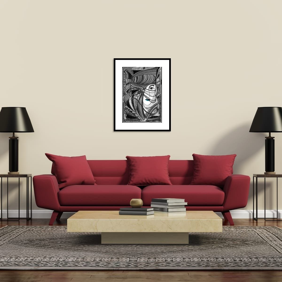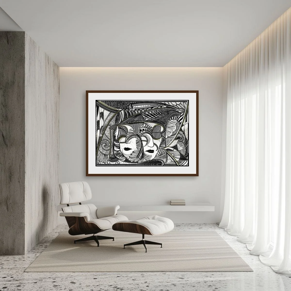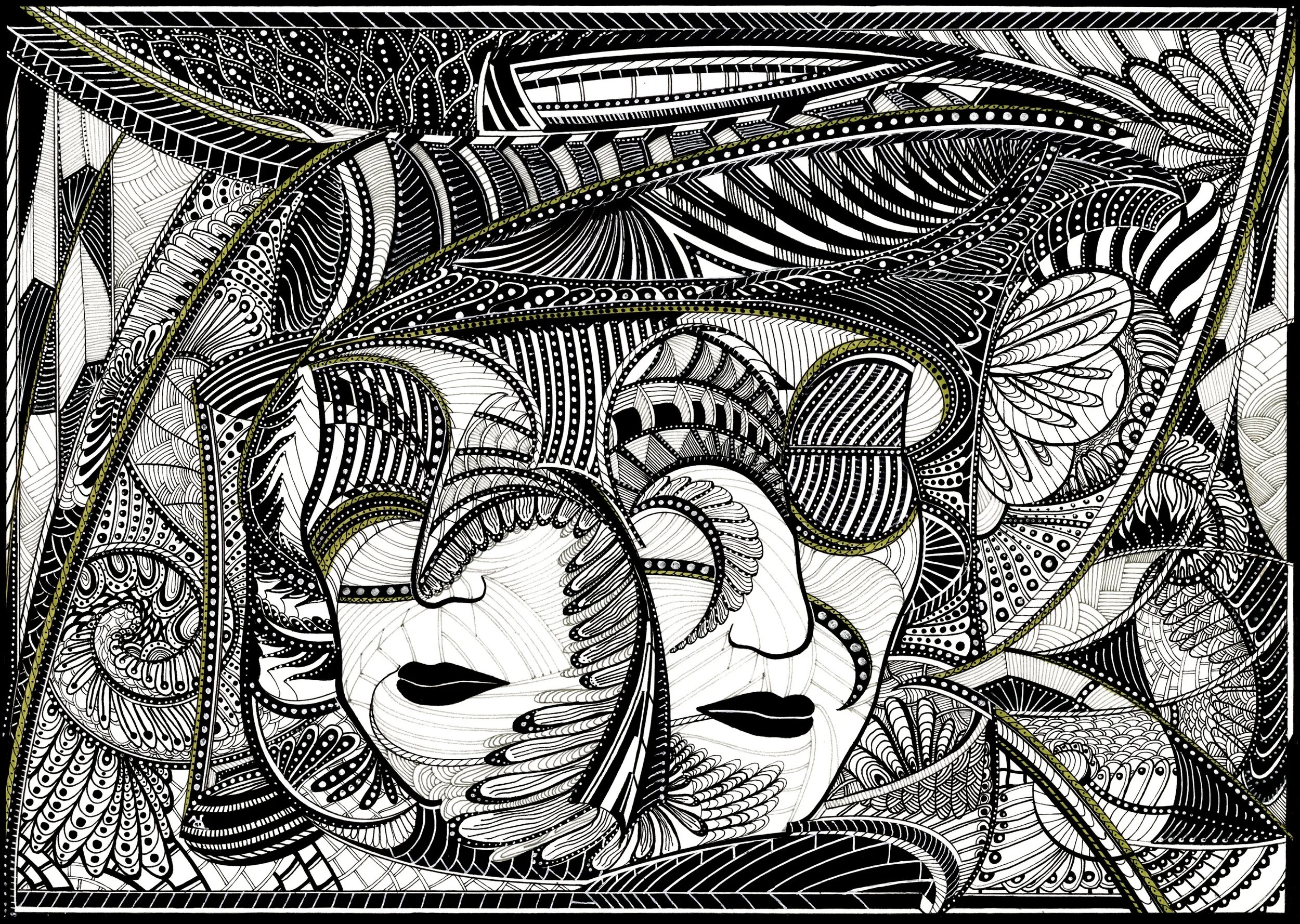 The artwork’s hypnotic patterns and meticulous detail create a sense of movement and depth, drawing the eye across swirling forms that suggest both the inner workings of the mind and the interconnectedness of nature. The faces, at once serene and mysterious, appear to float within this abstract landscape, their presence both grounding and otherworldly.