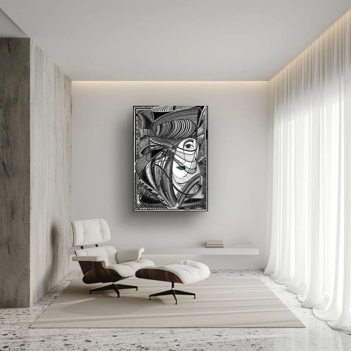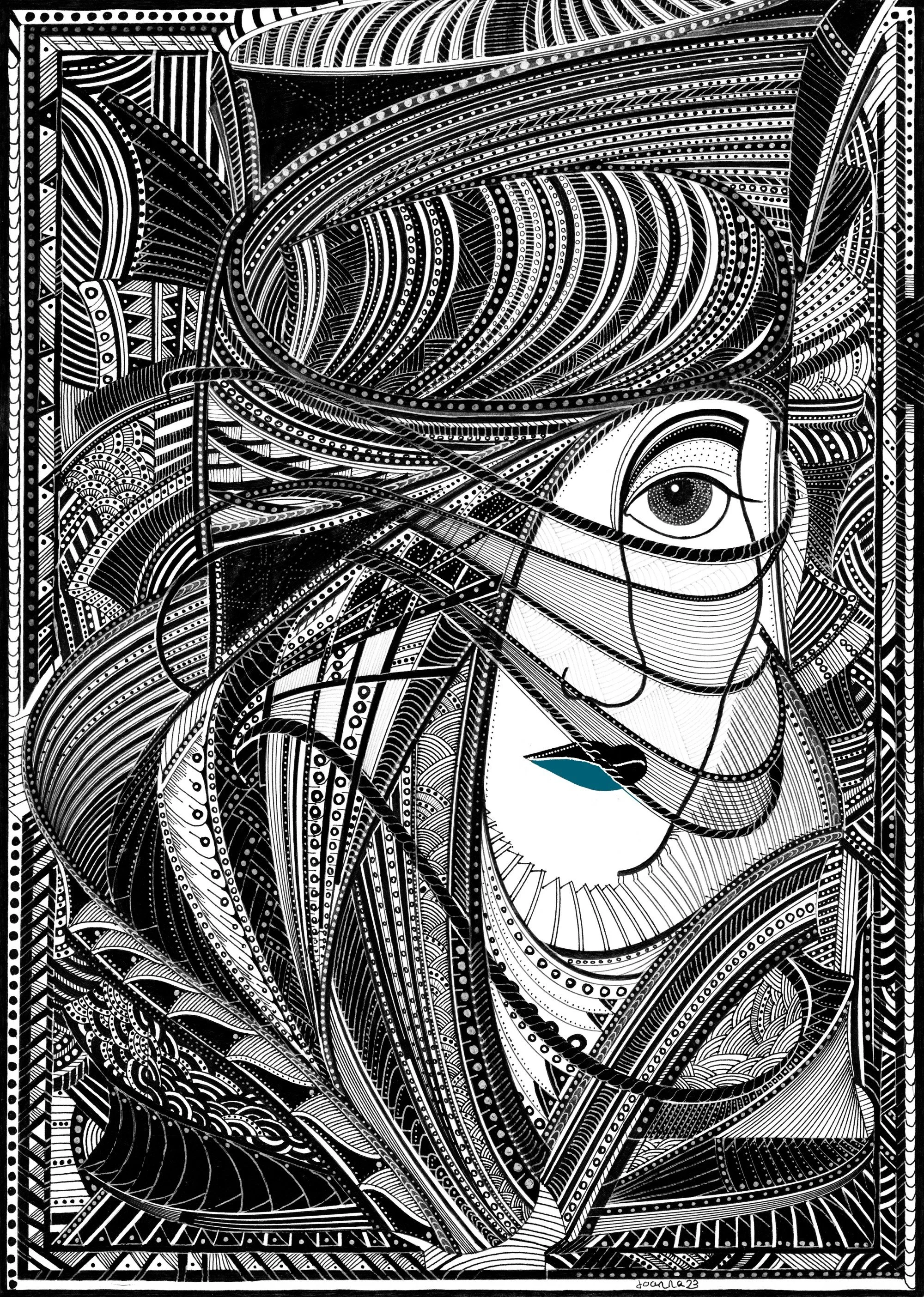 ‘Veiled’ is a striking black pen and ink work that masterfully explores the interplay between concealment and revelation. The composition centres on a stylised, enigmatic figure whose features are partially obscured by intricate, flowing lines—suggesting both mystery and quiet strength.
