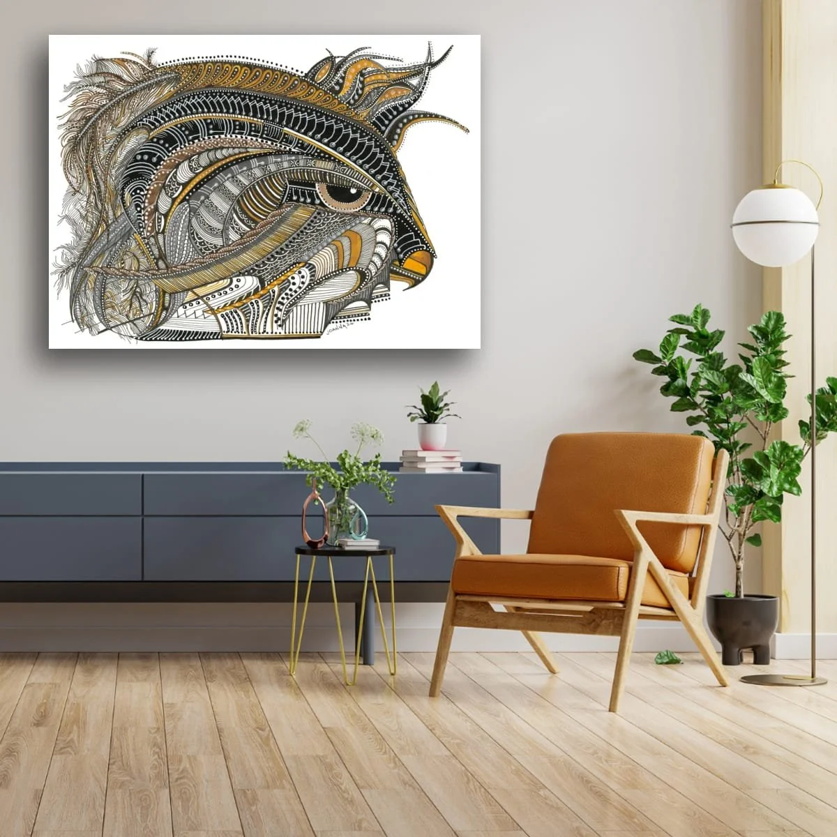 ‘Eagle Eyed’ serves as an homage to the majesty of the golden eagle. This piece captivates with its intricate, hand-drawn detail—each feather and contour meticulously rendered in a harmonious palette of amber, black, and white. The composition radiates energy and precision, echoing the eagle’s legendary vision and power.